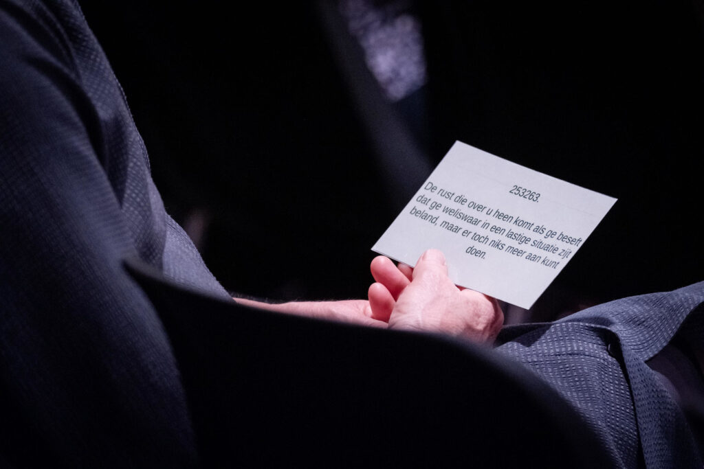 Hier schiet de tekst van Alle schone dingen tekort. Macmillan stelt de depressie voor als een losstaande en individuele case, waardoor het stuk aan de oppervlakte blijft hangen als deel van een sensibiliseringscampagne voor koppige introverte Vlamingen die ‘eens met iemand moeten gaan praten’. In zijn ontroerende en intieme vertolking, biedt Dewispelaere wel een antwoord op de vraag hoe het tij te keren. Hij gaat in conversatie met het publiek en vraagt van hen een empathische houding. Alsof hij hen al jaren kent, vertelt hij een ouder koppel over de tweede zelfmoordpoging van zijn moeder toen hij 17 jaar oud was. Hij kijkt hen in de ogen. Hun knieën raken elkaar. Wie een verhaal vertelt, zoekt naar erkenning en connectie. Het koppel knikt. Hun lichamen buigen zich naar de verteller toe, om te delen in zijn pijn en verlies. Dewispelaere weet verbinding te creëren tussen en met het publiek door samen met hen een unieke ervaring te creëren. Kijkers worden aangemoedigd om met kinderlijke speelsheid aan het script te morrelen, te improviseren en te verbeelden. Volgens Albert Camus kan het inzicht dat het leven zinloos is, ook opgevat worden als “a lucid inivitation to live and create, in the very midst of the desert.”
