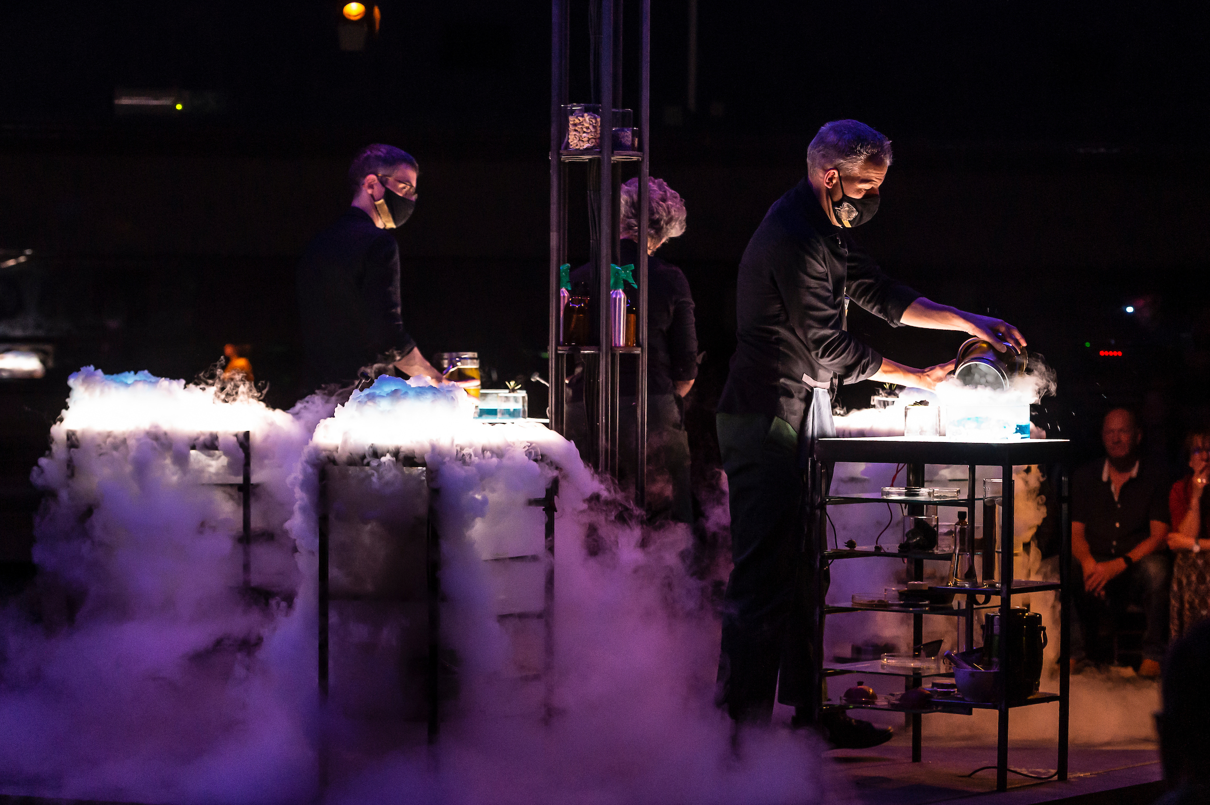 In dit geval krijgen de verschillende publiekstribunes rondom rond zicht op een alchemistisch laboratorium waar vier ‘magiërs’ met petrischaaltjes, kolven en pipetjes in de weer zijn. Af en toe mag het publiek delen in de oogst van hun geheimzinnige experimenten en dat leidt tot sensationele smaakervaringen waarvoor woorden, of toch de mijne, te kort schieten: hoe omschrijf je de explosie die een szechuan bloemknop in je mond veroorzaakt, of de ietwat griezelig zachte ‘plop’ die ontstaat wanneer een parel van honing en propolis uiteenspat tegen je verhemelte? Dat alleen al – mijn totale gebrek aan vocabularium voor deze ervaringen – is een uitdagende (intellectuele) sensatie.