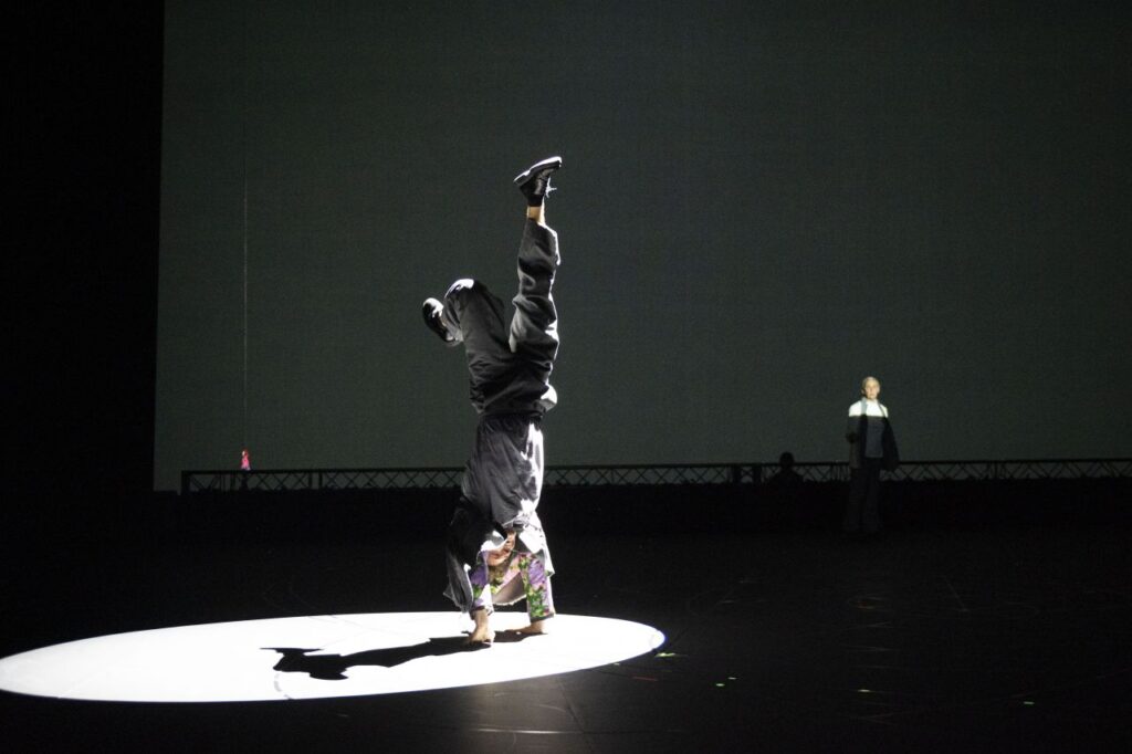 Wat Mariotte ook deelt met Brel is een immens charisma. Hoewel hij pas halverwege echt begint mee te dansen, valt hij al eerder op, en niet alleen op de momenten dat hij een songtitel schreeuwt. Deze danser is al elegant wanneer hij zit. Vanaf het moment dat hij op de voorgrond treedt, is hij hypnotiserend. Mariotte verbluft met vloeiende overgangen tussen breakdance en klassieke Rosas-choreografieën – Fase (piano phase) schemert onmiskenbaar door, maar we zien ook knipogen naar wat Bachs Six Brandenburg Concertos en zelfs naar de voorstelling Dark Red – Beyeler/RPS. Een hoogtepunt is Mariottes solo op Mathilde. Hoe hij uitbundig over de grond wervelt, zich haast smachtend tegen een microfoon gooit die vooraan op het podium staat – het is een kanshebber voor beste choreografie van het jaar. Niet toevallig is dit het eerste nummer waarna het publiek klapt.