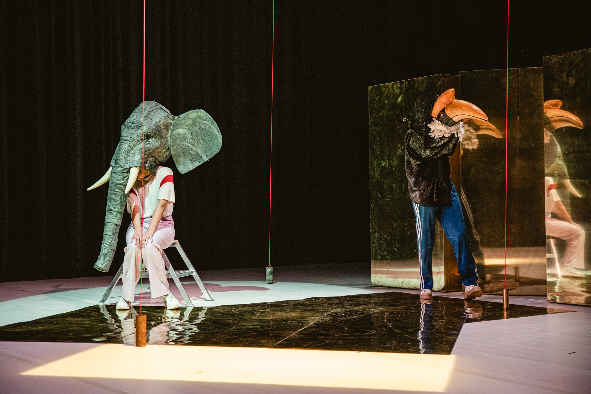 De olifant die even later verschijnt weet perfect wat er van hem wordt verwacht. Hij komt zachtjes schommelend met zijn slurf naar voren, klimt op het krukje en gaat op één been/poot staan: ‘tadaaa!’ De dieren spelen toneel, ze doen kunstjes en vragen om applaus – alleen zijn het geen dieren, maar mensen verkleed in dieren, en dat roept een breder bewustzijn op met heel wat akelige referenties: van de in-trieste snoepverkopers-in-berenpakken die in Amerikaanse pretparken hun onderbetaalde hondenjob uitoefenen tot veel ergere vormen van ‘verkleedpartijen’: de zoo humains bijvoorbeeld van eind de negentiende eeuw, waar mensen expliciet werden verplicht tot het performen van hun vermeende ‘wildheid’ of ‘dierlijkheid’. Tot dier maken lijkt, vanuit een vanzelfsprekend antropocentrisch denken, gelijk te staan aan het onderwerpen aan onze wil.