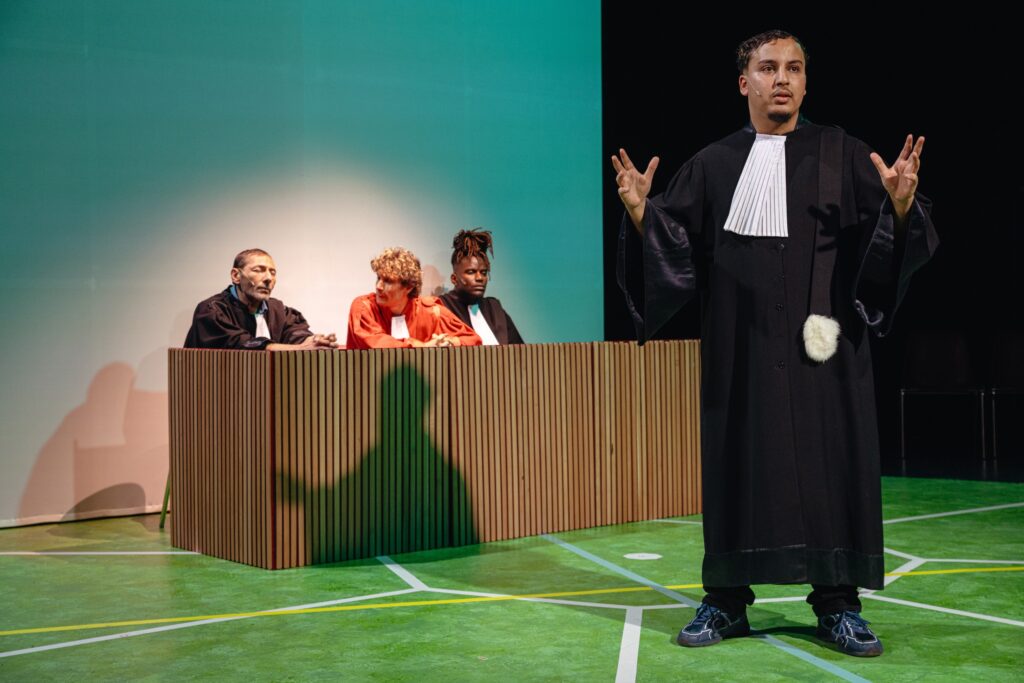 De spelers verschijnen in toga op scène. Met enkele eenvoudige elementen wordt een rechtszaal opgezet, waarin de Belgische staat wordt gedagvaard voor het schenden van mensenrechten in haar gevangenissysteem, dat ondertussen grondig wordt bevraagd. ‘Is het wel zo rationeel en verlicht als we denken?’ en ‘Wie zit er in de gevangenis? Fraudeurs? Bedrijven die schadelijke stoffen blijven lozen?’ Het grote merendeel van de gedetineerden zijn mannen uit kwetsbare contexten, vaak met een migratieachtergrond en beperkte schoolopleiding, klinkt het. ‘Is het dan niet tijd om ook het systeem in vraag te stellen?’ De rechter is niet overtuigd: ‘Ik denk dat we in deze tijden vooral ons precair rechtssysteem moeten beschermen.’ Ook de tegenpartij maakt bezwaar: ‘De progressieve ideologie corrumpeert het rechtssysteem (…) Zero tolerance dient de maatstaf te zijn.’ Een nieuw soort gevangenis waarin gedetineerden worden ingedeeld op basis van de ernst van hun misdrijf wordt als oplossing naar voren geschoven. Of het huren van gevangenissen in het buitenland, zodat veroordeelden hun straf in het land van herkomst kunnen uitzitten. Voorstellen voor alternatieve straffen of detentiecentra worden weggewuifd, want ‘wat dan met de slachtoffers?’ Dat De Gevangenis de focus van de individuele gevangene naar het systeem verschuift, zorgt hier opnieuw voor een belangrijke nuance: in een systemische kritiek wordt niet voorbijgegaan aan de realiteit van misdaad, maar wordt vooral de urgentie onderstreept om de manier waarop we ermee omgaan te bevragen.