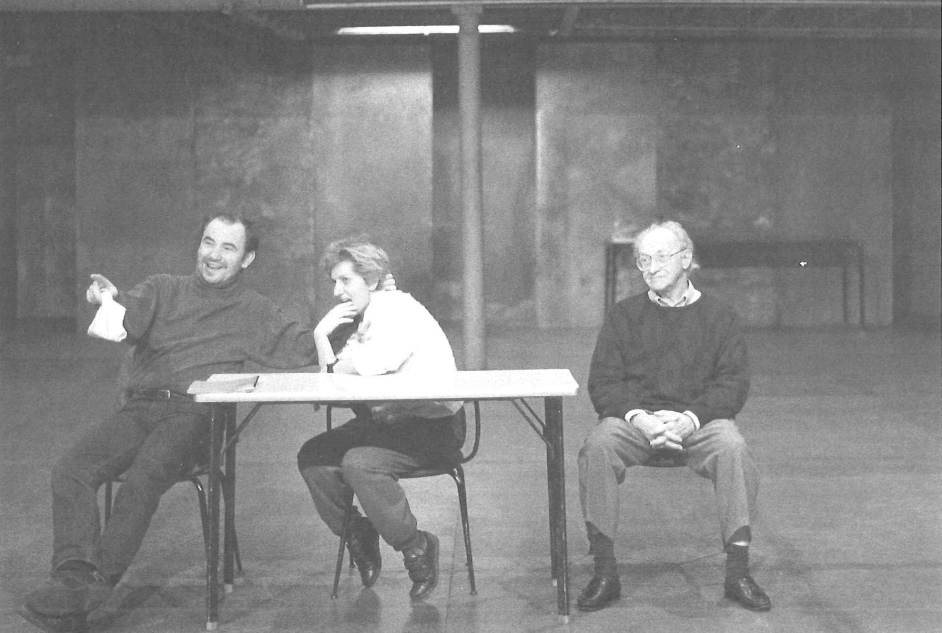 Het is die achterliggende eenvoud die Jan Ritsema in zijn regie van dit stuk voor het Kaaitheater opgezocht heeft. Hij doet geen enkele poging om de gelaagdheid af te pellen, om de densiteit te doorgronden, om de intertekstualeit aan te geven, om iets van tijd en plaats te verbeelden of zelfs maar te suggereren, om het spel van de maskers te laten zien of om de structuur van het drama bloot te leggen. Hij kiest voor de kaalslag van een lezing waarbij de regisseur als oplettend luisteraar toekijkt en vragen stelt, maar nooit ingrijpt of iets oplegt. Hij schetst en geeft contouren aan, maar kleurt niet in, vult niet in, dikt niet aan. Dat doet hij in de eerste plaats door voor een extreme afschraping van de theatrale middelen te opteren. Het theater wordt ontvleesd om het skelet van een tekst te tonen. Zelden zag ik een grotere beperking van de middelen: de acteurs verschijnen in de toevallige kleding van de dag, belichting beperkt zich tot wat neonverlichting, en het decor bestaat uit niet meer dan een tafel en een paar stoelen: een repetitieruimte waar de acteurs het publiek uitnodigen tot wat op het eerste gezicht niet meer lijkt dan een lezing. De nulgraad van theater.