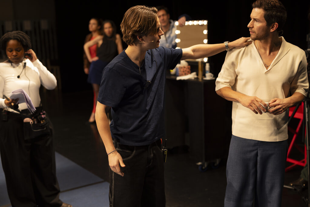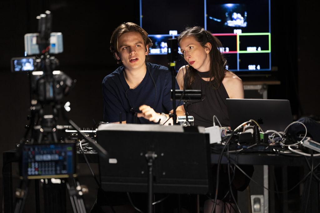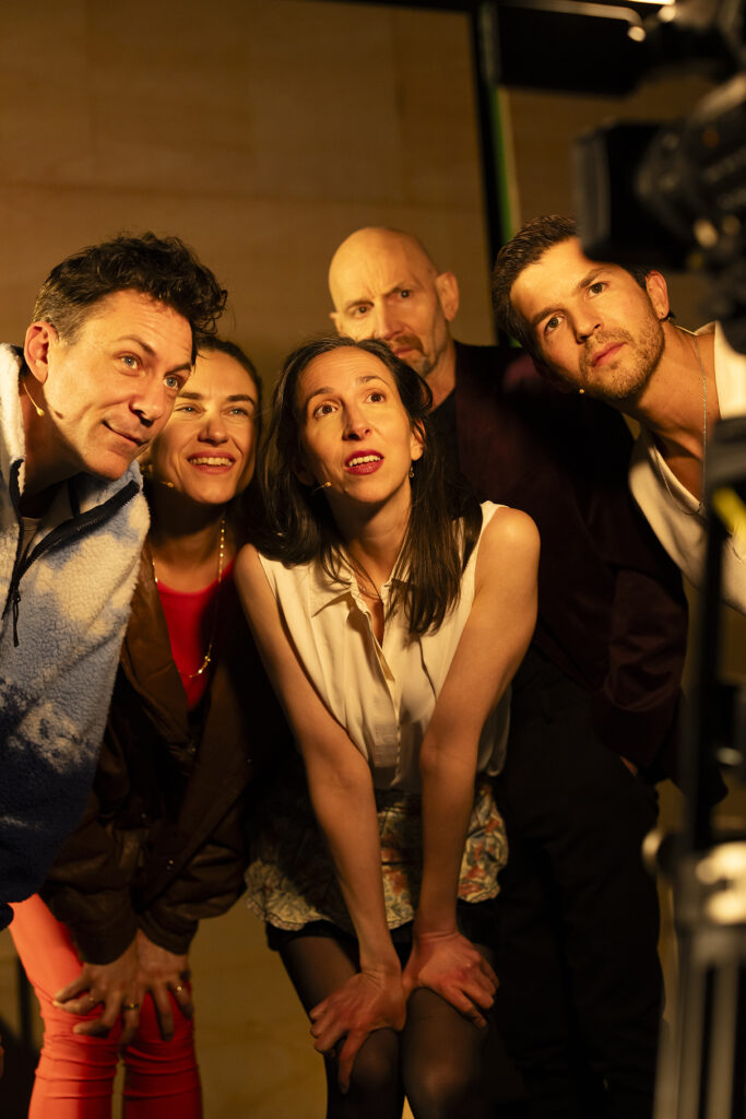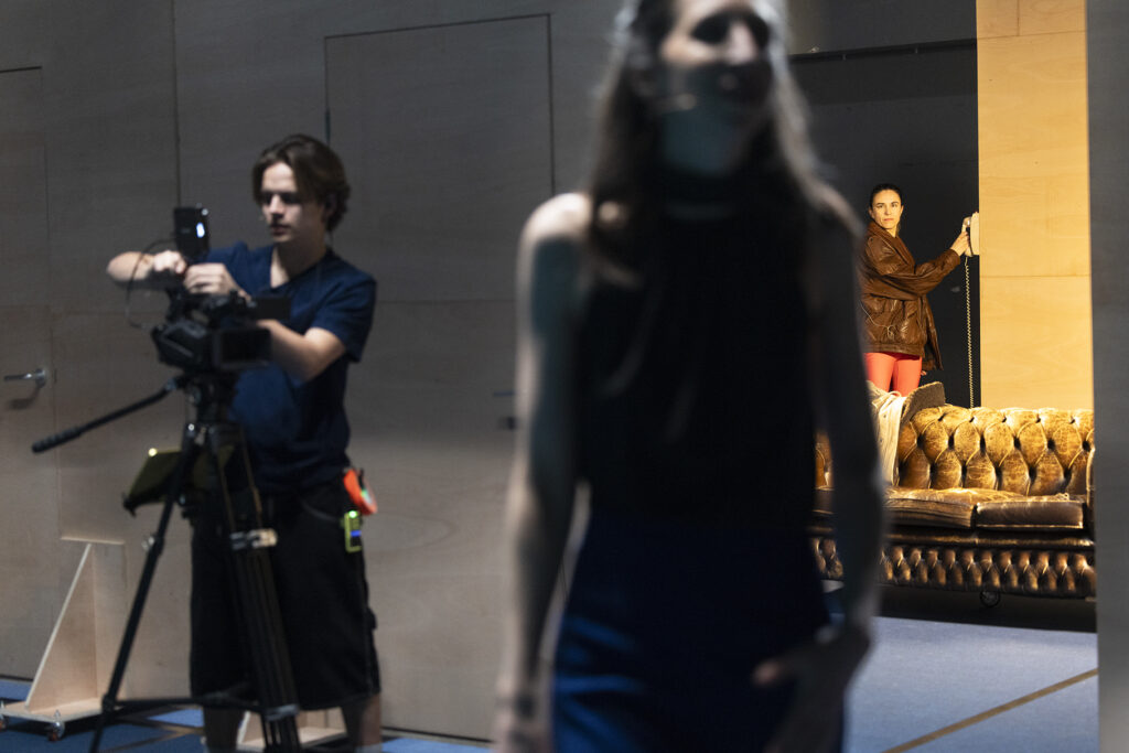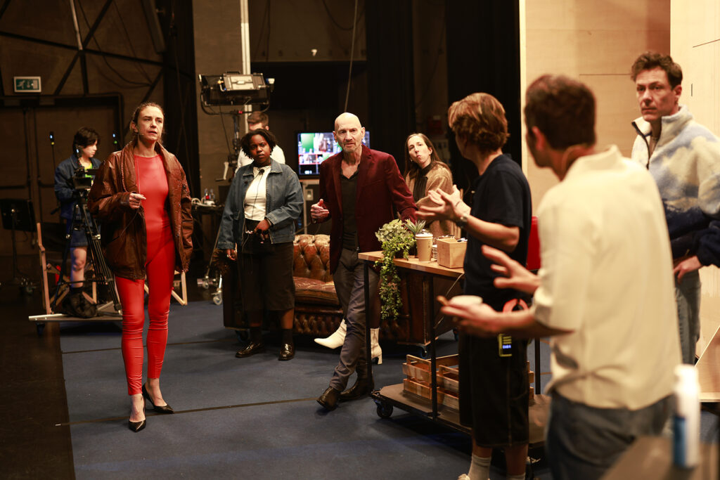 Overal op scene zijn er vensters die de realiteit ontdubbelen: spiegels, camera’s, deuren, monitors. Het levert (metatheatrale) slapstick op – in geval van de struikelgevoelige Peter Van den Eede met deuren en apparatuur, maar ook met de toverwoorden ‘cut’ en ‘action’ van regisseurs Kes Bakker en Chanou Mekenkamp, wanneer iemand niet doorhad dat ze ‘al aan het spelen’ waren. Is het onverwacht uitspreken van die woordjes een kritiek op hoe acteurs (en kunstenaars in het algemeen) slaven worden van de productielogica van winst? In elk geval maakt het van de regisseurs letterlijk goden: ze hebben de macht om voortdurend extra lagen en werkelijkheden te scheppen.