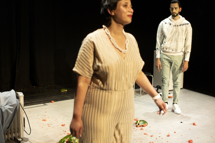 Het toneelstuk van regisseur Hans Van Cauwenberghe en theaterhuis Rataplan hervertelt El Bachiri’s boodschap, maar ruilt zijn losse, monologische hoofdstukjes in voor een dialoogvorm waarin Mohamed (Rashif El Kaoui) en Loubna (Amara Reta) samen de scène delen. Tenminste, het is de geest van Loubna die verleidelijk rond hem cirkelt. Zij is de geliefde die met Mohamed herinneringen ophaalt aan betere tijden, maar inmiddels is ze ook zelf een herinnering geworden, die als schim in de huiskamer blijft hangen.