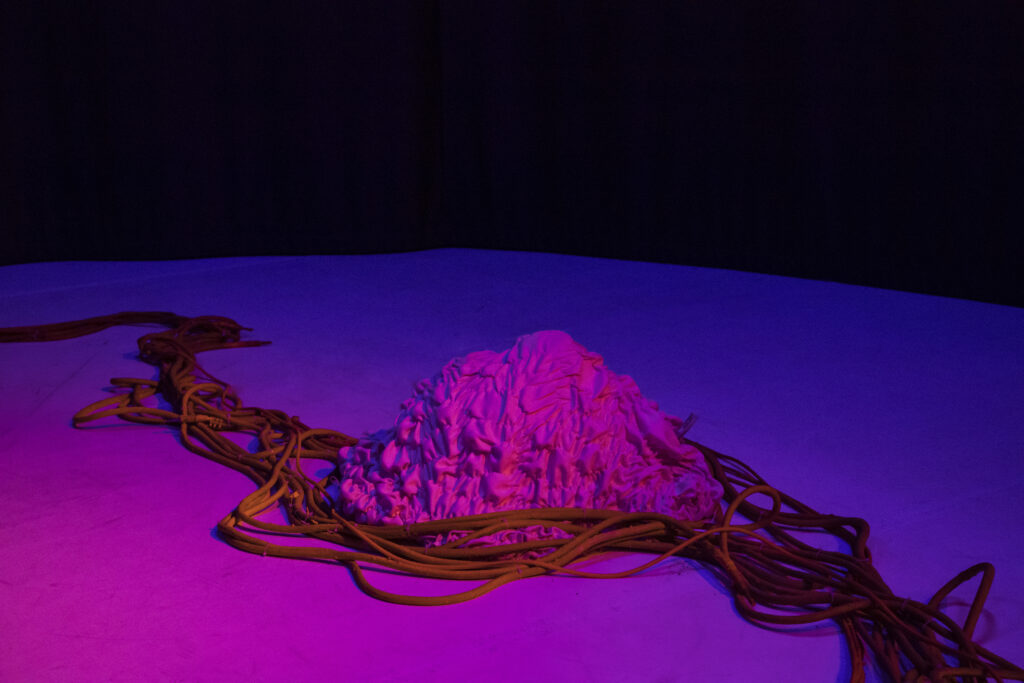 Wanneer het publiek de zaal betreedt, ligt het decor er roerloos bij. Het straalt verstilling uit. Achteraan de scène hangt een groot glanzend lichtgroen doek, de vloer is wit, er zijn een drietal hobbels die bedekt zijn met een crèmekleurige satijnen stof. In het midden van de tribune ligt een dikke tros gelige kabels die uitmondt en vertakt op het podium. Wanneer het applaus, een uur later, losbreekt, straalt het decor allang geen verstilling meer uit: het heeft geademd en gepuft.