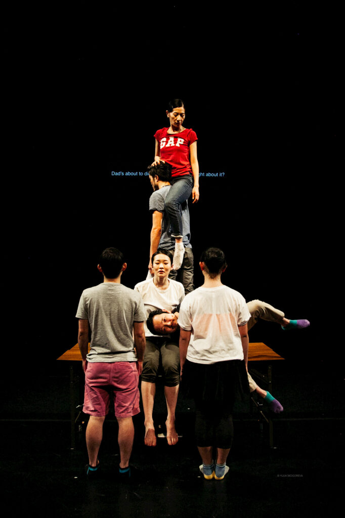 Zodra het onding op zijn poten staat, ontspint zich een postdramatische hybride tussen grand-guignol, familiedrama, klassiek ballet, documentaire en hedendaagse dansvoorstelling. Ondanks dat potpourri aan insteken valt de hele voorstelling als een strakke puzzel in elkaar. Dat is voor een groot deel te danken aan de uitgebeende tekst van Jun Tsutsui die ons als mantra door de voorstelling begeleid. De auteur speelt zelf de familie-vader die zijn gezin teistert met de vraag wat ze na zijn dood zouden doen met het geld van de overlijdensrisicoverzekering. Onverstoorbaar manisch en met een cynische grijns in het gezicht dreunt Tsutsui zijn variaties op die vraag op: ‘Wat als papa nu dood gaat…’, ‘Wat als papa te horen krijgt dat hij binnen zes maanden dood zou gaan…’. ‘Wat als papa het langste van ons allen blijft leven…’ Net omdat de dood vaak zo’n taboe is aan een familietafel, of het nu hier of in Japan is, raakt de tekst ons in al zijn onverbiddelijkheid. Vooral in de speculatieve antwoorden die de vader op zijn eigen vraag geeft, legt de tekst een kleinburgerlijke bekrompenheid bloot die in het licht van de dood te pijnlijk voor woorden is: ‘Wat als papa doodgaat? Dan kopen jullie vast die elektrische fiets om de helling naar de supermarkt te overwinnen.’