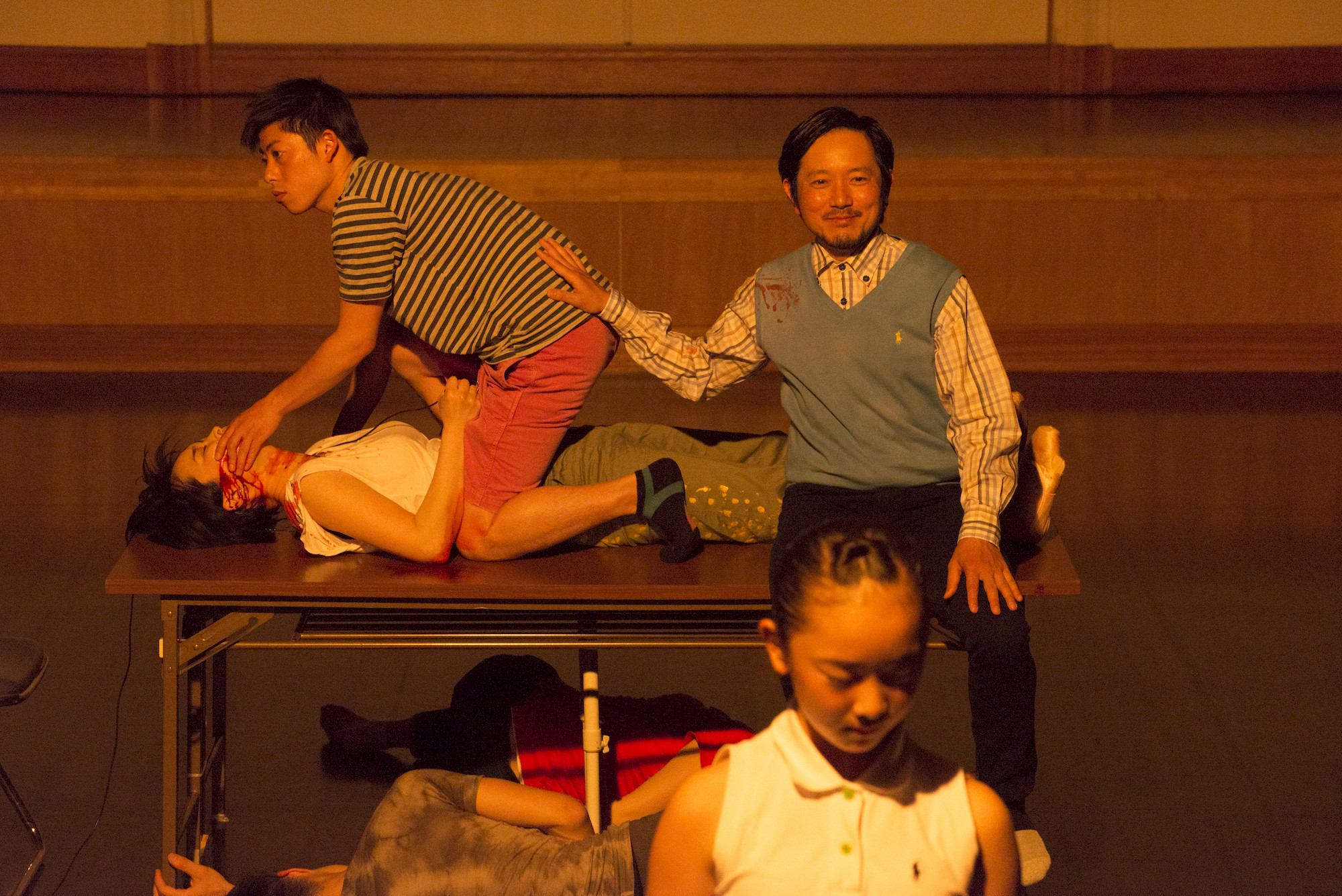Daaraan herinnert ook de opkomst van de verzekeringsmakelaar, die ontslag blijkt te hebben genomen en zijn leven aan triatlon wijdt. Uit zijn sportmanie lees je een al even herkenbare doodsangst af, als uit de bezetenheid van de vader met zijn verzekering. Want onder die oppervlakte van dialogen over sport en verzekeringen, gaapt een duizelingwekkende zinloosheid en wanhoop, die nergens wordt uitgesproken, maar door de anderen wel wordt gedanst. En terwijl de anderen hun macabere dans dansen, zien we de verzekeringsman -geestig gespeeld door acteur Kentaro Sato- als een vis op het droge in alle ernst zijn komische crawlbewegingen maken.