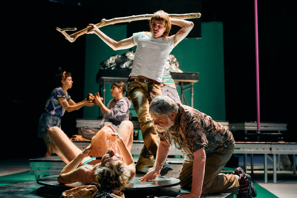 The synopsis of this piece reads that ‘In FRICTION, individual beliefs and identities rub together as if they were pieces of dead dry wood.’ It is surely no coincidence that at about halfway into the show, all performers come together to make a campfire around Vincent, by stacking branches onto him in the form of a pyramid while he looks around quietly, motionless. The angelic lighting on Vincent’s presence ensures we don’t miss the importance of this tableau. However the campfire is never lit, even when Anna Franziska tries to by creating sparks with flint stones. The idea seems clear: the friction that causes these sparks, does not lead to fire.