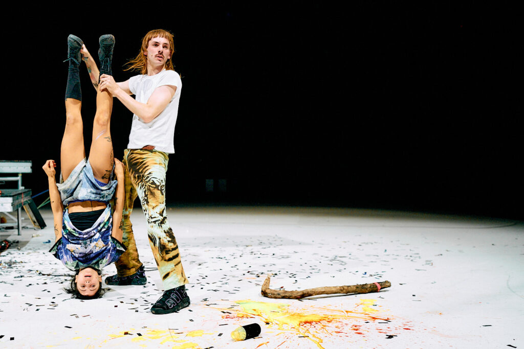 While the audience walks in, all of the performers except for Rodriguez herself are at the back of the stage. Martina Calvo, Vincent Focquet, Anna Franziska Jäger and Robert Steijn are performing a sort of collective lymphatic drainage massage on Simon Van Schuylenbergh. The whimsical, relaxing music is fitting for a massage salon. My friend whispers they are actually enacting the ‘elements massage’, a commonly used technique to help your colleague-performers relax before a show. When Anna Franziska and Vincent (they call each other by their first names so I will do the same) move the massaging to the front scene, they start talking about where their disappointment is located in their body, what they can ‘be for each other today’, and how their last appointment at the acupuncturist in Saint-Gilles went. The chakras are just about flying around – although it remains ambiguous how serious Anna Franziska and Vincent take themselves. ‘Erupt!!’, they jokingly shout while running off.