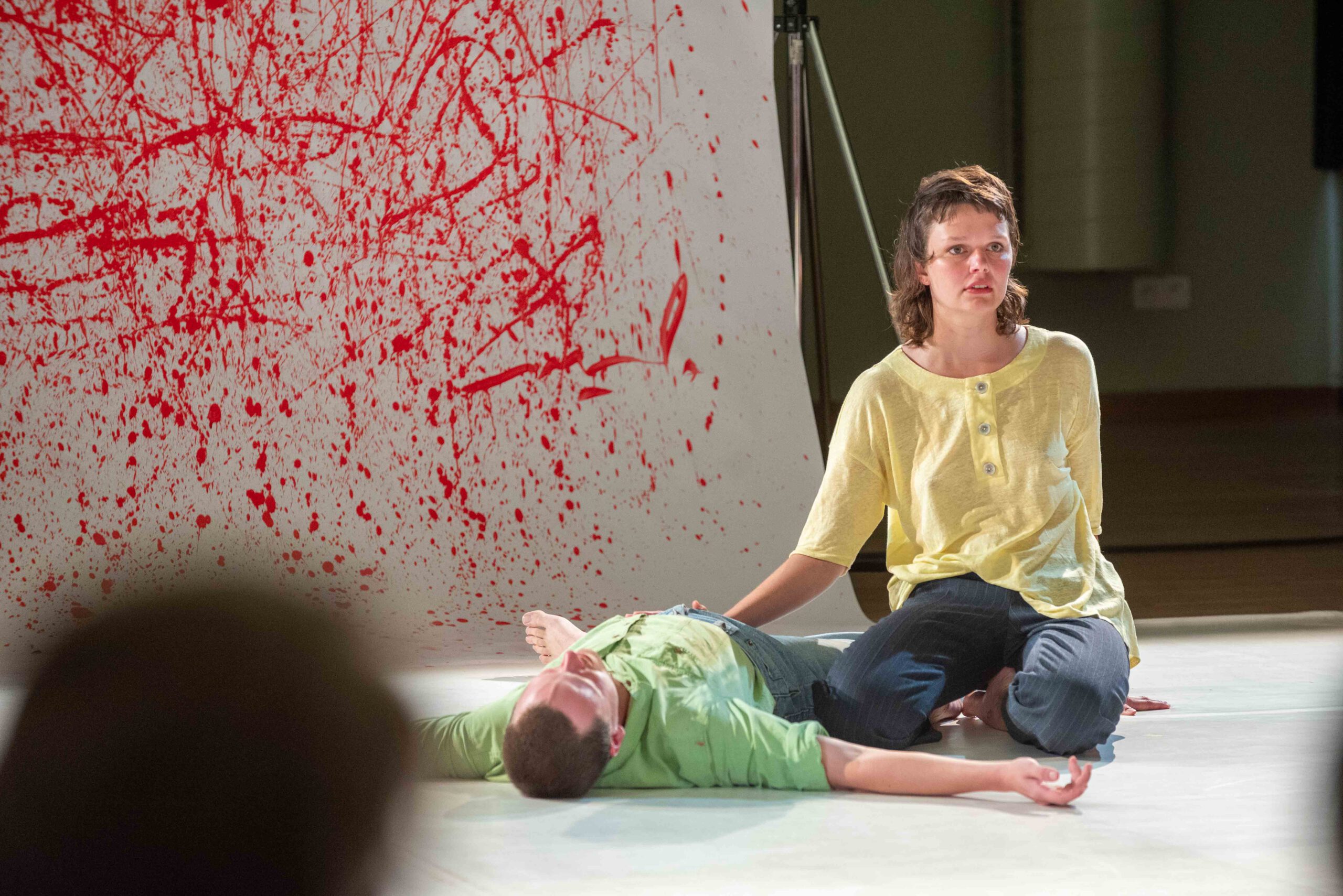 Een tweede kantelmoment is wanneer Vandroogenbroeck zich naakt in een apenpak hijst – een mooie knipoog naar Despentes’ boek King Kong Theory – en instructeur wordt van een les zelfverdediging voor vrouwen. Beide speelsters laten zich in de rol van verkrachter en verkrachtte plaatsen, en hun blikken, gedweeë handelingen (zoals het uittrekken van hun kledij) en de relatie tussen de ‘aap’ en de ‘girls’ geven de hele scène eerder iets pornografisch, obsceen. De vrouwen raken zodanig ‘oververhit’ dat ze met een emmer water afgekoeld moeten worden – wat leidt tot een op de poep glijdend waterballet. Opnieuw een teken dat ook al lijkt het dat de man hier de overhand heeft, we ons nog steeds bevinden in de fantasie van beide vrouwen. En daar begint het te snijden, want ook in die fantasie vinden de verkrachting en het geweld plaats, grenzend aan de zelfveronachtzaming. Het is die constructie van een verbeelding en verlangen die zich vormen in reactie op seksueel geweld, maar waarin ook geweld opnieuw een belangrijke plaats inneemt, dit keer in een tegelijk zelf-pijnigende én wraak nemende en ‘reinigende’ functie, die dankzij de dramaturgie van Guilty of Love knap duidelijk wordt. Er schuilt een gevaar in dit verlangen en fantasie, want waar houdt de controle op, wanneer gaat degene die je uitnodigt in een dominerende rol, te ver? Die spanning stuwt ook de voorstelling verder, tot op een gegeven moment de bron zelf in de ogen gekeken moet worden. Wanneer de eigenlijke verkrachting verteld wordt, schakelt de voorstelling dan ook even terug om dit moment zijn concentratie en impact te laten hebben. Want het is natuurlijk eerder al te ver gegaan. Het gaat zelf zo vaak te ver, dat de reactie in de fictie van het theater – wraak, moord, bloed, applaus, een mooi beeld – haast niet ver genoeg kan gaan.
