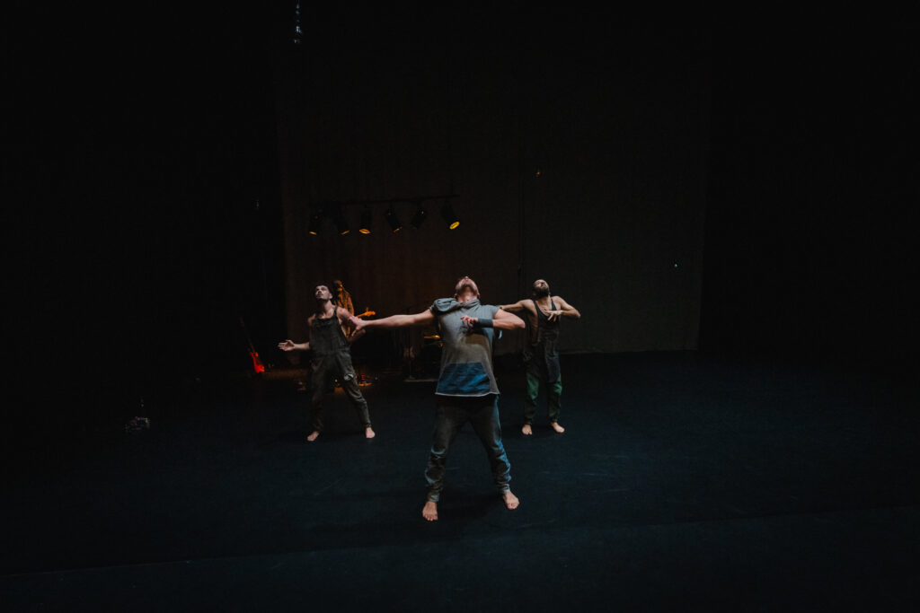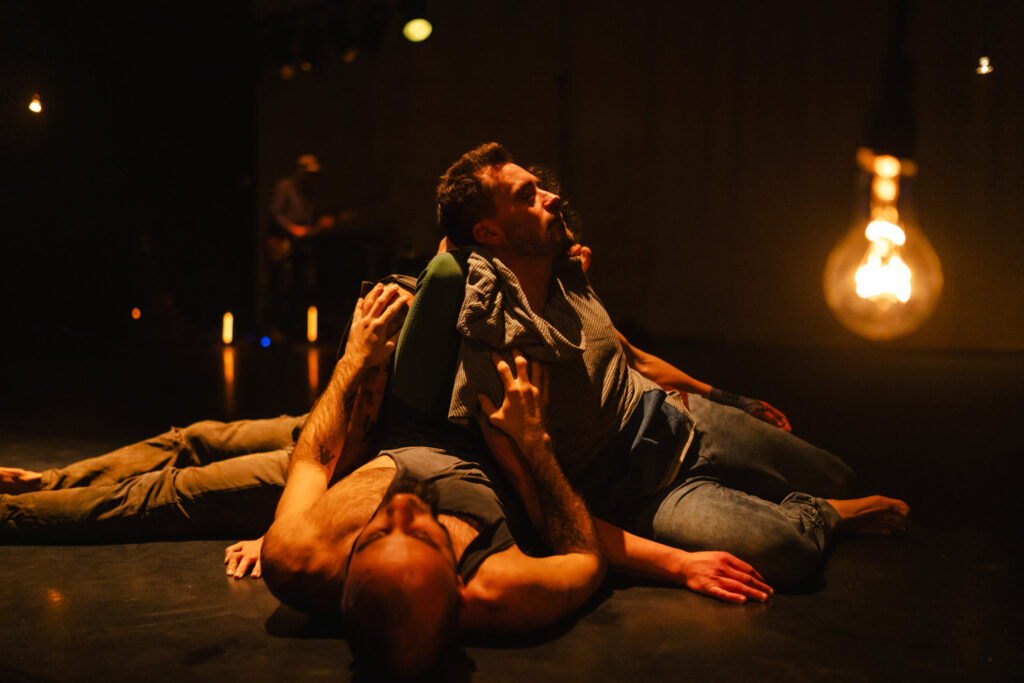 The spiritual slow intermezzos throughout the piece intertwine and counter the explosive and painful moments. Every time the dancers go through an emotional turmoil, every sense is absolutely flooded. The lights shine bright, the live music is loud and heavy, the eyes dart from one impressive feat to another, Oliveira is doing somersaults, Cunha and Seabra engage in balancing acts. The men sweat profusely, their pumped muscles glisten, they leave wet stains on the black stage floor, their body odour is inescapable. But then come the slower moments and the musicians come to the foreground. The drummer Sylvester Vanborm tenderly plays on the stones or performers’ bodies. The guitar player Stijn Vanmarsenille uses a looper to record a tender chant. The men are trying to heal.