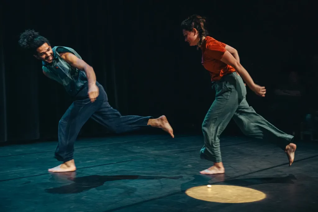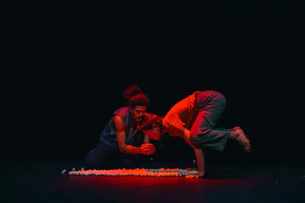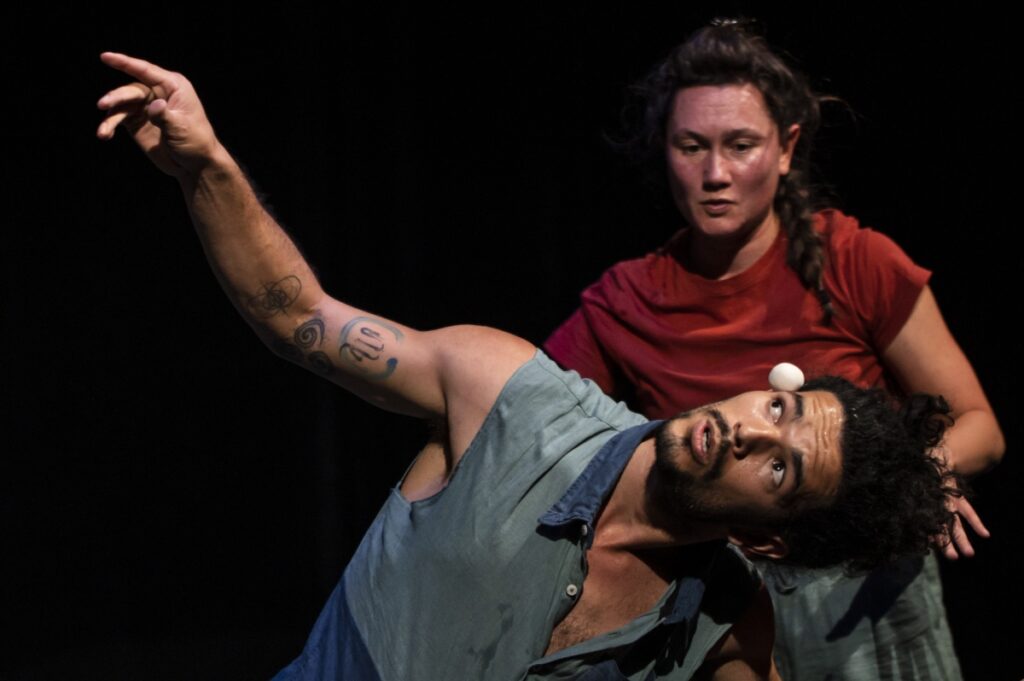 Een spot gaat aan, een eenzaam balletje rolt plots van onder de tribune het lege speelvlak op. Voor je het goed beseft glijdt performer Keivin Benavides Hidalgo op z’n buik van onder de coulissen richting het balletje. Even later zoeft zijn compagnon Sophie van der Vuurst de Vries erachteraan. Ze puffen en blazen met z’n tweeën het balletje over de vloer en zorgen ervoor dat het telkens net niet terug onder de tribune rolt. De kinderen supporteren volop. Al snel rolt er een tweede balletje de vloer op.