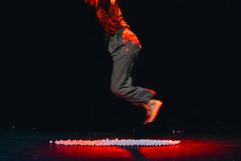 Te pas en te onpas rollen of vallen er van overal en nergens nieuwe balletjes de vloer op, telkens goed voor een explosie van gejoel uit de zaal. In het begin zijn de balletjes nog overzichtelijk te tellen, te rangeren, te manipuleren, op een rij of in een cirkel te leggen… Bij elke plotse verschijning van nieuwe balletjes gaan de twee performers op zoek naar andere manieren om de massa balletjes onder controle te krijgen, om de orde te herstellen. En in dat ordenen zit telkens een nieuwe speelkans. Het abrupte reageren van de performers op elke nieuwe impuls is van een herkenbare kindsheid: eerst doen en dan pas denken, om vervolgens spelenderwijs te ontdekken wat nu precies de spelregels zijn.