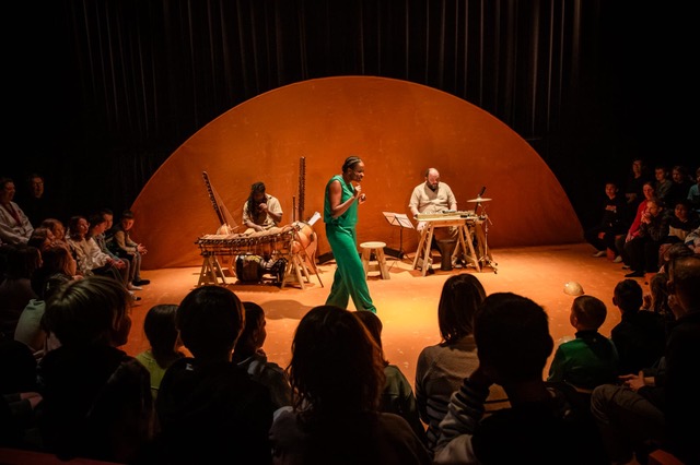 Na afloop van The Round haasten we ons van de grote naar de kleine zaal. We hebben maar een paar minuutjes voor Amadou van start gaat. Gelukkig wacht Aminata Demba ons geduldig op. ‘Niemand is hier gevangene van de tijd’, stelt ze ons gerust. Gekleed in een smaragdgroen pak van Leentje Kerremans heet ze ons welkom. We worden uitgenodigd onze schoenen uit te doen terwijl Demba jong en oud begeleidt naar een plaatsje in de knusse, halfronde tribune die net als bij The Round op scène staat. We zitten dicht op de huid van Demba en haar twee begeleidende muzikanten. De achterwand van het speelveld is een warm-oranje halve cirkel, als een ondergaande zon. Met dank aan deze gezellige scenografie van Peter De Bie zuigt Demba ons met haar begeesterende vertelstijl in luttele seconden moeiteloos mee in het kleurrijke universum van Amadou.