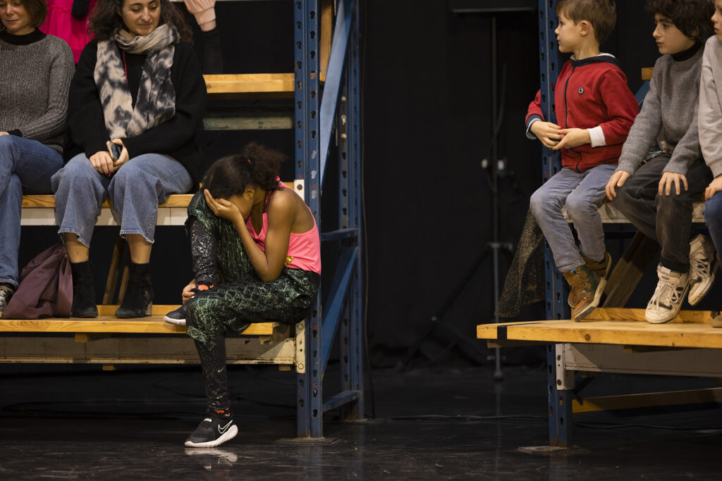 Het lijkt vooral in de blik van de volwassenen een interessant gebeuren te zijn. Het zijn dan misschien leeftijdgenootjes die het beste van zichzelf geven op de scène, het jonge publiek in de tribune lijkt er niet echt meteen door bevangen. Na het scanderen van een gedicht van Rilke dansen de kinderen opnieuw in groep en vol energie richting een climax. Terwijl ik en de andere volwassenen onder de indruk zijn van hoe professioneel en gedisciplineerd de jonge lichamen bewegen, blijkt het voor de jongeren in de zaal moeilijker om erbij te geraken. Het doet op zich geen afbreuk aan de voorstelling, maar maakt wel dat ik me afvraag of de voorstelling niet vooral door kinderen is, meer dan dat ze voor kinderen is. Dat het vooral wij grown ups zijn die zo gefascineerd zijn door al dat jeugdige geweld.