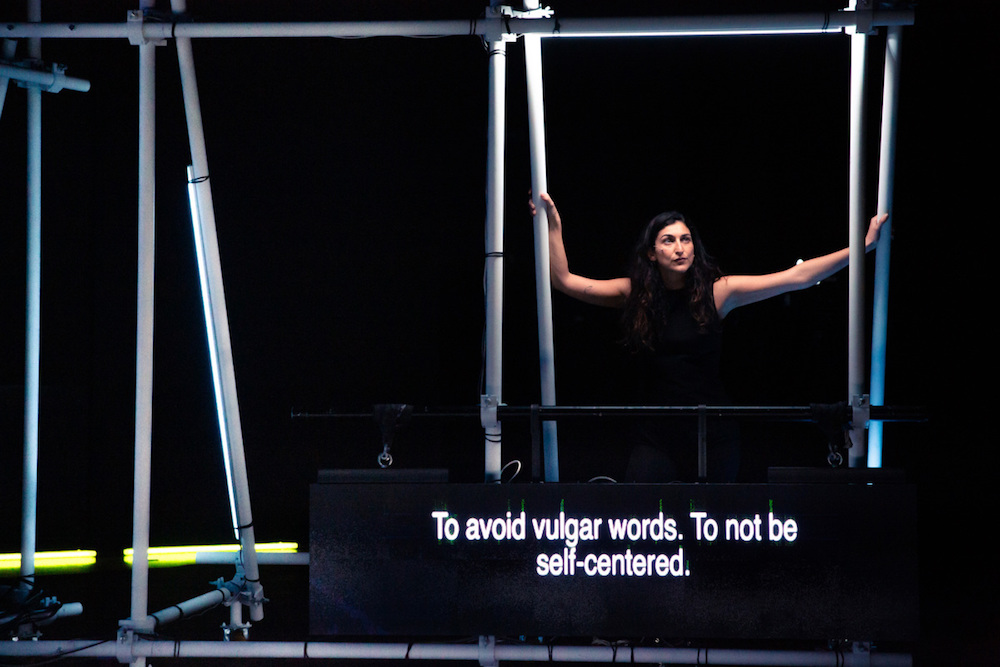 I can give two accounts of Sachli Gholamalizad’s solo performance Let us believe in the beginning of the cold season, which premiered on May 11 at KVS in the frame of KFDA. First one: It is a show by a very virtuosic performer, sliding back and forth between semi-autobiographical storytelling, video interviews of Gholamalizad’s mother, spoken poetry of Forugh Farrokhzad’s verses, and singing; a show that is built on the hyphenations of the performer’s identity across Iran and Belgium, with the modular light and screen fixture as a material aid for, as well as a metaphor of, such division of sense of belonging. This account is not necessarily untrue, and it wouldn’t spoil the work’s pleasure for the potential viewers. The other story I might tell is less pleasant, and precisely about the problem of pleasure.