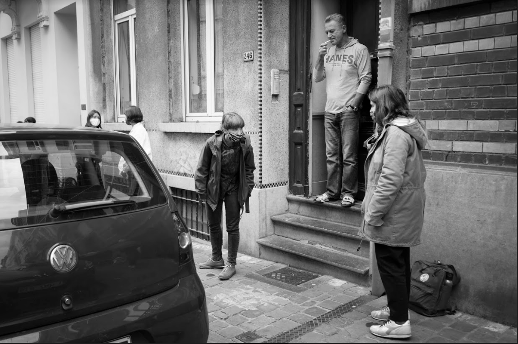 Letters from Attica is in alle opzichten een co-performance. Je neemt actief deel en zorgt er zo voor dat de voorstelling plaatsvindt: haar gebeuren is jouw doen. Onder meer aan de twee uiteinden van de mensenketting en op de hoek waar die rij negentig graden wordt gebogen, staan professionele performers. Ze zijn aangevers, eerder dan doorgevers, en ook mogelijke voorbeelden van de theatraliteit waarmee de boodschap wordt bemiddeld: joyeus dan wel fluisterend op een samenzweerderige toon, met veel of weinig articulatie van de woorden, met of zonder ondersteunende gebaren… Iedere deelnemer bespeelt dat scala van mogelijkheden uiteindelijk naar goeddunken. Maar hoe je de boodschap ook relayeert, je zit bij het overdragen onontkoombaar in de rol van een performer die altijd weer opnieuw een korte voorstelling geeft aan de volgende in de rij. Letters from Attica is inderdaad een ‘spreekvoorstelling’ waarin het toe-spreken van een ander met meer of minder reflexiviteit zichzelf representeert. In corona-tijden gebeurt dat wel op een gehalveerde manier. Het verplicht te dragen mondmasker verhult immers het lichaamsdeel dat essentieel is voor orale communicatie. De individualisering bij het doorgeven van de woorden en frasen blijft daardoor beperkt: er is geen aansprekend gelaat, enkel een in tweeën gedeeld gezicht met een persoonlijke bovenhelft en een generisch-artificiële onderhelft. De stem komt zo nog meer op het voorplan, wat past bij het totaalopzet van de performance. Misschien vraagt die dus ook in post-covid 19-tijden om het opzetten van een mondmasker.