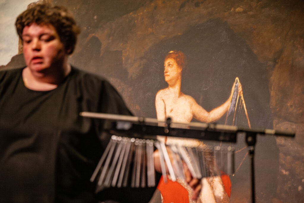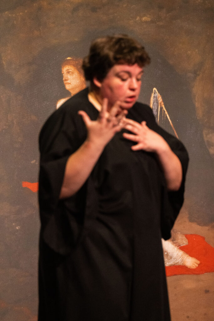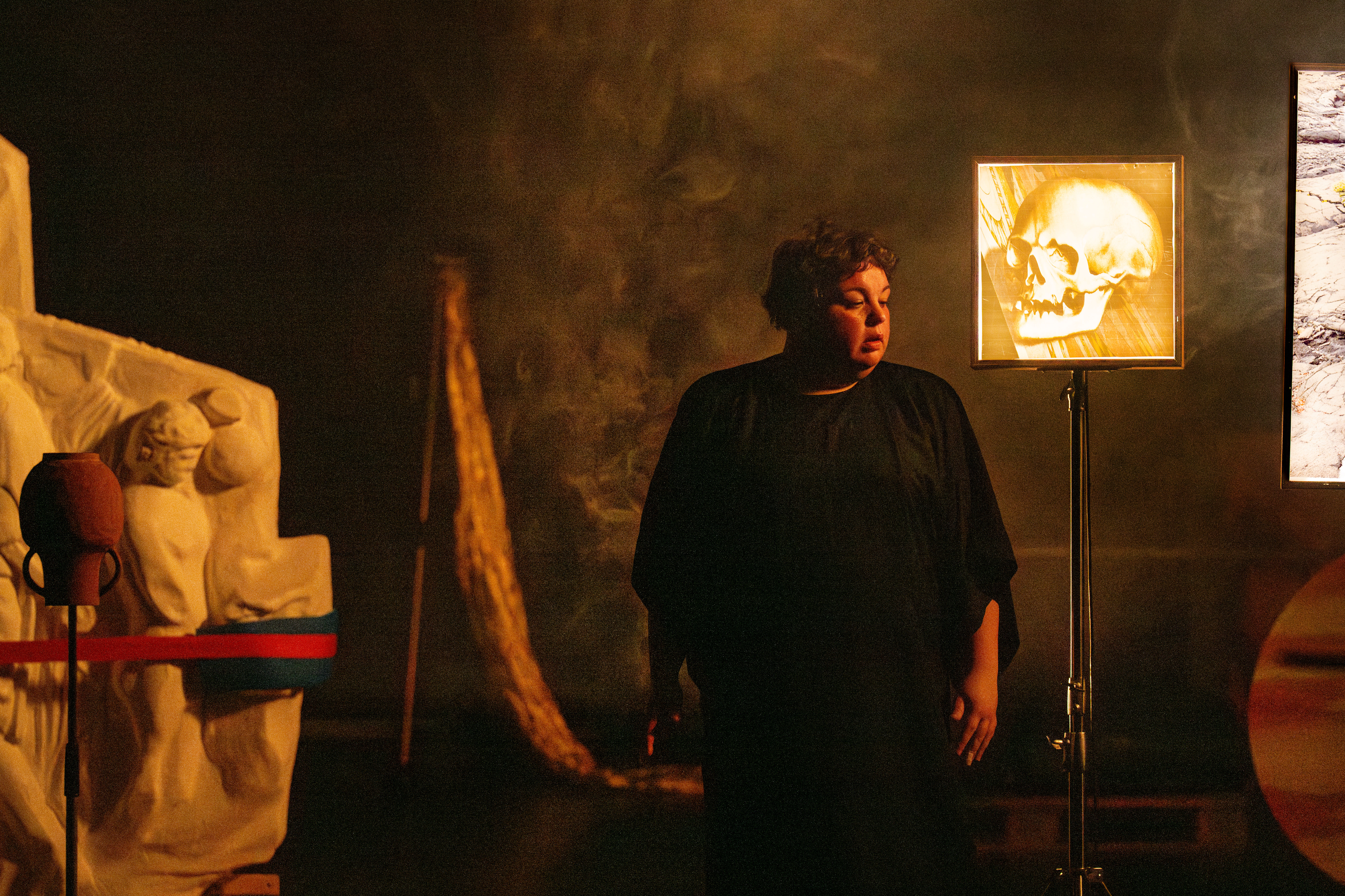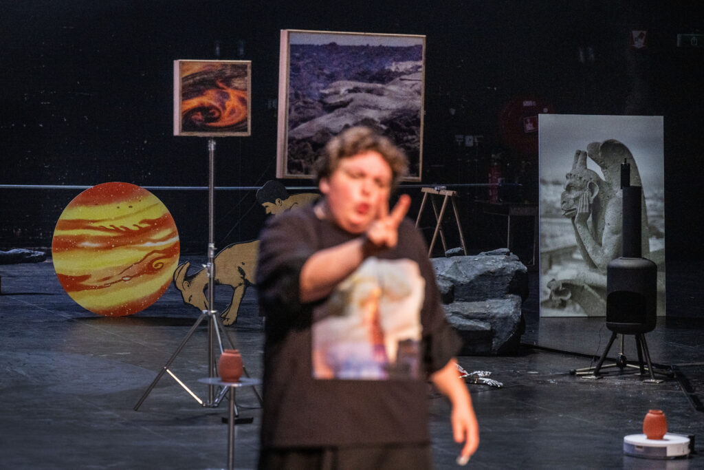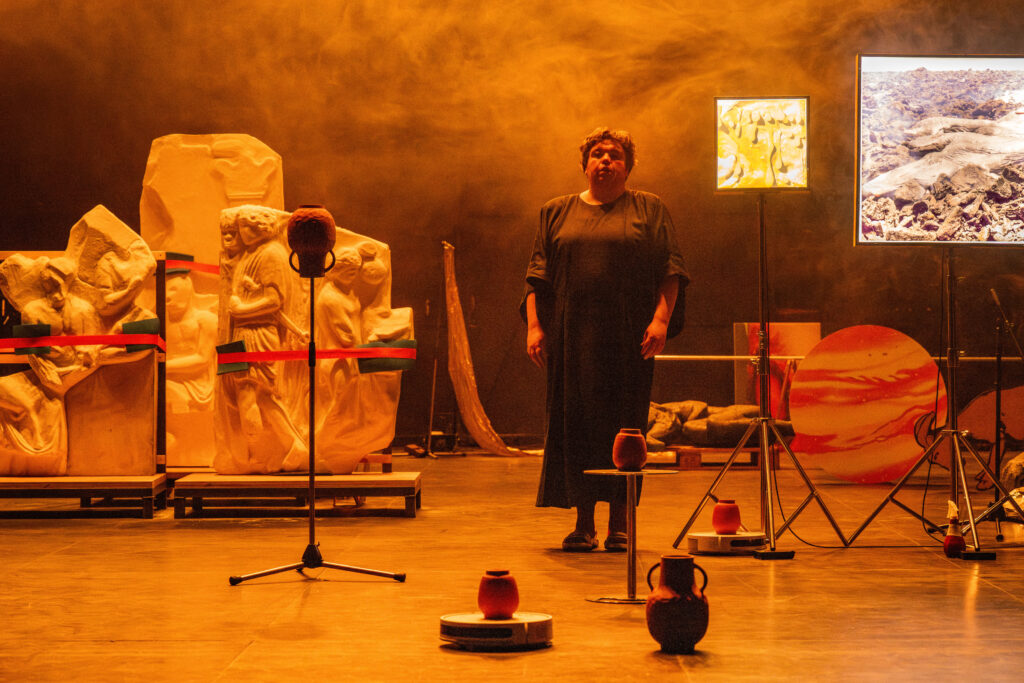 ‘Wilt gij bij mij blijven?’ Mantike speelt zich af in een grote ruimte vol artefacten uit verschillende era’s. Alsof iemand een loods heeft ingericht met zoveel mogelijk beelden die samen onze geschiedenis moeten vasthouden. Kleien kruikjes staan zusterlijk naast planeten die uit een educatieve poster lijken geknipt, rotsblokken naast uitvergrote foto’s van geslachtsdelen en half afgewerkte sculpturen uit de oudheid naast een immense reproductie van Arnold Böcklins Ulysses en Calypso (1883). Tussen al dat beeldende geweld dwaalt een figuur, gehuld in een zwart gewaad, rusteloos, op de vlucht voor het zoeklicht en de ogen van het publiek. Vanachter haar handen weet ze uiteindelijk een gierend ‘Goedenavond Bourla’ uit te brengen, om zich nadien meteen weer te verstoppen.