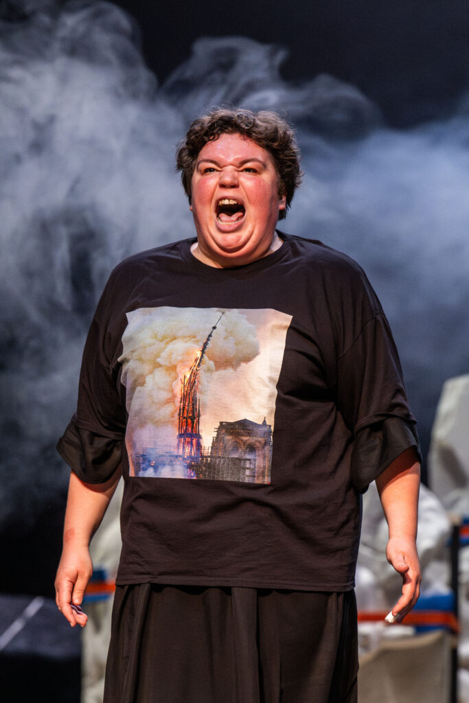 De gewelddadige AZDAT-sound dooft uit en De Schutter verschijnt in een T-shirt met daarop een afbeelding van de brandende Notre-Dame. Een slimme manier om onze hedendaagse omgang met rampspoed weer te geven en het verhaal te sturen richting de brand in een eeuwenoud gebouw. Een plek, zou je denken, waar de dingen zwijgend spreken. Maar in de monoloog wordt een afslag genomen naar de vraag waarom duizenden eiken – ‘de kathedralen van het bos’ – moesten sneuvelen om deze oude dame weer op te bouwen. Het is onduidelijk waarom nog een extra thema in de tekst nodig is, en welk gevoel ermee wordt beoogd: moet het publiek verontwaardigd zijn over die ongelijke behandeling tussen verschillende soorten kathedralen? De vooruitgang toejuichen die een Notre-Dame in gerecycled plastic mogelijk maakt? Of toch vooral droefheid voelen over de stenen die negenhonderd jaar aan gebeden in zich droegen en die tot puin vergingen? Vooraleer je daar als publiek wijs uit wordt, banjert de tekst alweer verder richting een zoveelste spervuur van woorden.