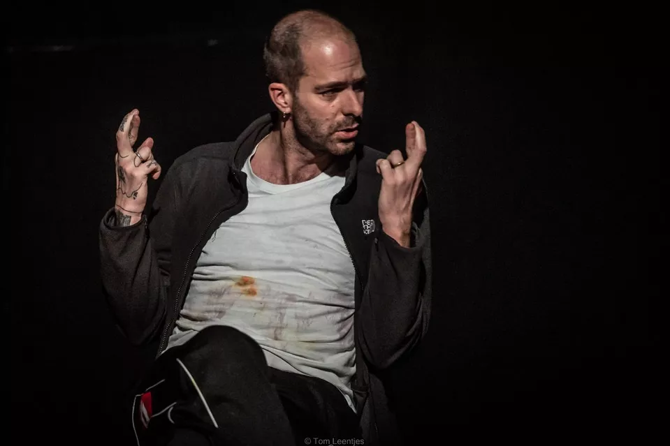 Sébastien Hendrickx komt zijn publiek ophalen in een wachtruimte. Hij zal ons een verhaal vertellen, zegt hij, met tal van personages. We zullen niet al hun namen onthouden, maar dat hoeft ook niet, sust hij. Moddertong — denk moeder, taal, aarde — is voor het grootste deel puur verteltheater: Hendrickx raadt ons zelfs aan om onze ogen regelmatig te sluiten.