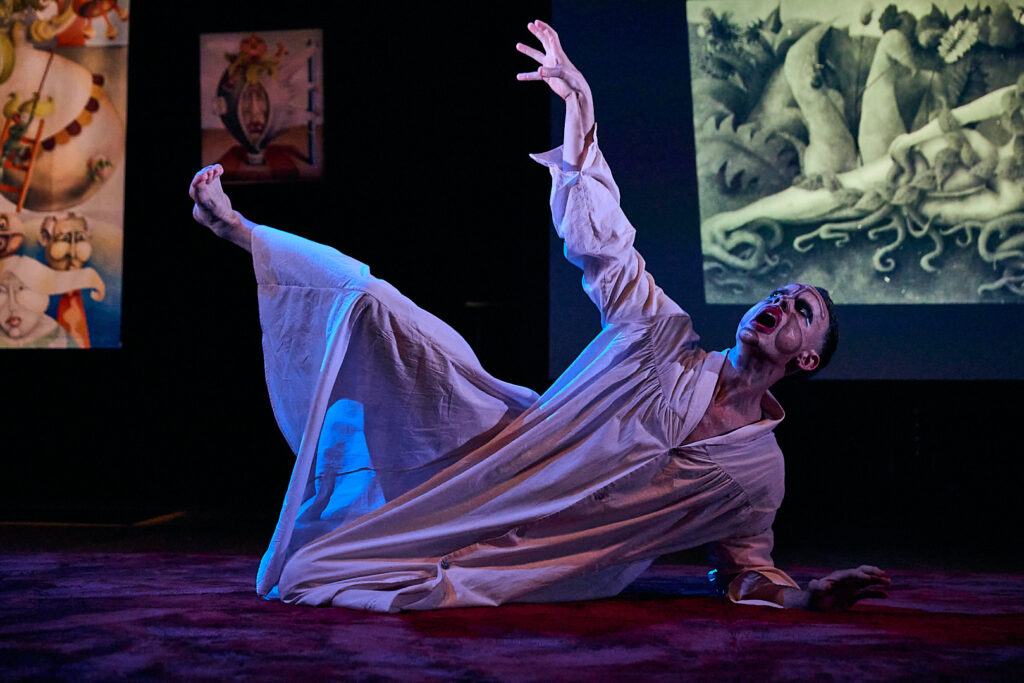 Bij het binnenkomen, zie je verschillende (afbeeldingen van) schilderijen hangen, geschikt rond een geel uitgelicht projectiedoek. Achter dit doek staan twee silhouetten, in tegenlicht. Welkom in de Wunderkammer van Pablo en Fede, en van de vele Monica’s die doorheen de voorstelling de revue zullen passeren. Op zachte toon zetten Lilienfeld en Vladimir al vertellend de voorstelling in, die naast over het leven van hun moeders ook over hun ‘kind’ Monica belooft te gaan.