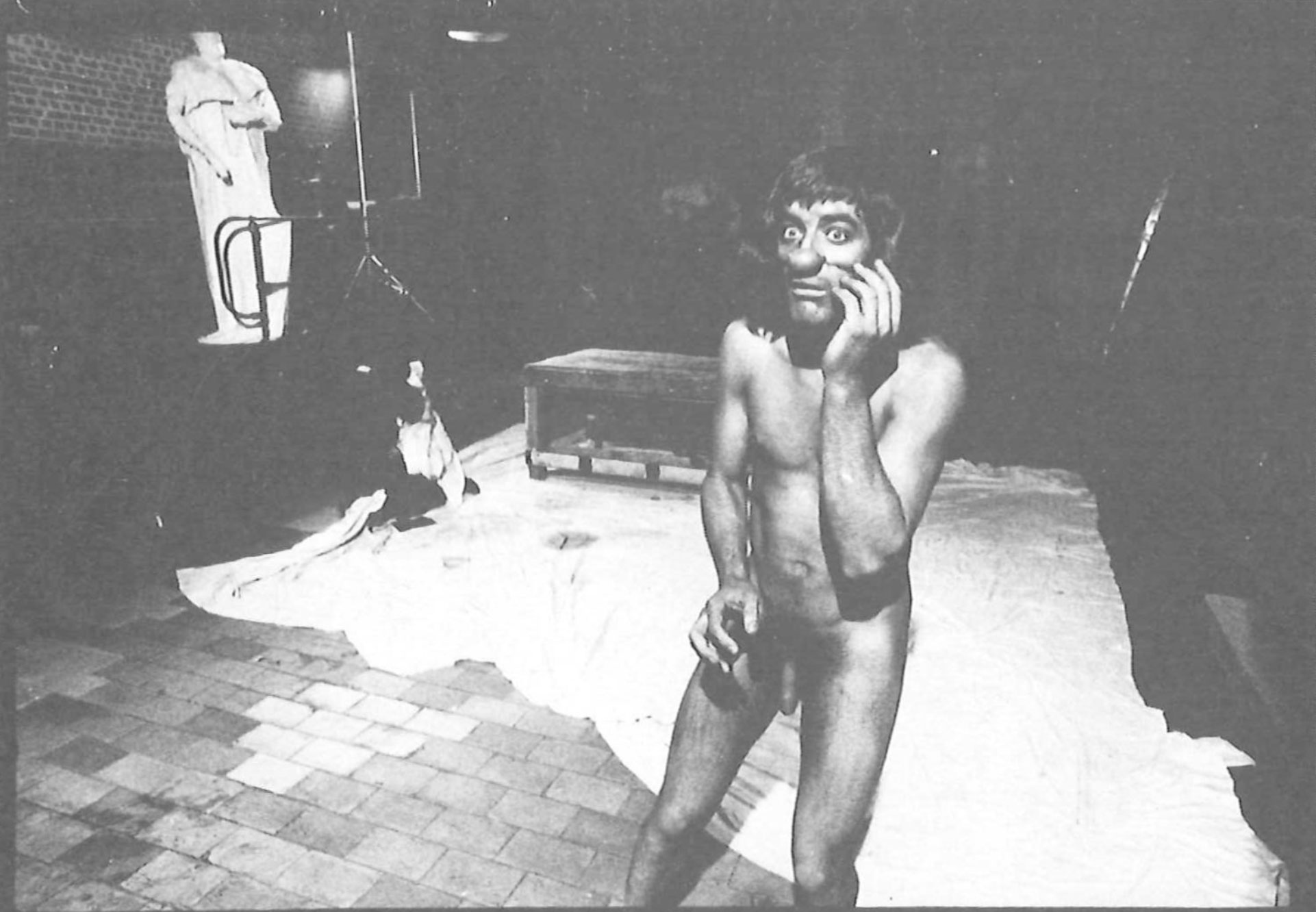 Situatie; een praktikabel in een witte ruimte, enkele witte gordijnen waarachter de personages kunnen verdwijnen en vanwaar ze kunnen verschijnen. Een groot wit laken op de vloer. De pratikabel dient als bed, bank, kast, doos, uitkijktoren, deur, huis, kist etc. Op de houten kist ligt een nogal vreemde figuur, verwilderd, een dromer, een slaapwandelaar die gekonfronteerd wordt met zijn droomfiguren die verschijnen, De aktie van die figuren (een man en een vrouw) wisselt snel, ze worden snel anders, ze springen van hef ene personage in het andere. Op de vloer tikt een wekker. De nachtelijke bezoekers waarmede de ikfiguur gekonfronteerd wordt behoren tót de realiteit, maar worden door de droom veranderd, vertekend, gevaarlijker of belachelijk, ijler of brutaler… In de witte ruimte staan, liggen, zitten, hangen levensgrote plaasteren poppen, naakt of half aangekleed. Tussen de verschillende droomsekwensen worden beelden uit de natuur (vrouwelijke en mannelijke vormen) geprojekteerd.