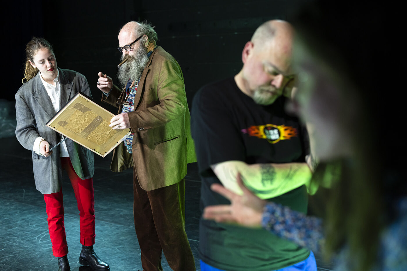 Nachtland doet bij momenten denken aan Thomas Bernhard, zeker in de onderliggende gedachte dat alle Duitsers, hoe gelouterd ook na 1945, antisemieten blijven. Natuurlijk is dat een hyperbool, maar ze legt veel bloot, en verklaart misschien ook de schroom, in Duitsland, om de huidige excessen van het zionisme te bekritiseren – een vorm van psychologische omkering. De verdienste van deze sobere enscenering bij Tg STAN – enkel een transparant plastic doek achteraan, en arbitraire lichtwissels – is dat ze aan het denken zet, slechts heel af en toe provocerend, meestal krijg je alle tijd om na te denken bij de emotionele en intellectuele kronkels van deze doorsnee-Duitsers. Of van doorsnee-Vlamingen, want met ons collaboratieverleden gaan we vaak even onhandig om, ook na twee of drie generaties. Je ziet dus toneelspelers die helder spreken, die niets illustreren, die allemaal wel wat naïef ogen, die af en toe uitschieten, die het publiek zoeken – de eerste rijen mogen het schilderijtje zelfs even vastpakken en doorgeven – en die ons toeschouwers geruststellen, toch op het eerste gezicht. Misschien is het allemaal wat té voorzichtig, té genuanceerd, al is de afloop – Louise… – nog erg verrassend. Het hele bouwsel stort zo ongeveer in, maar ik ging dus niet spoilen.