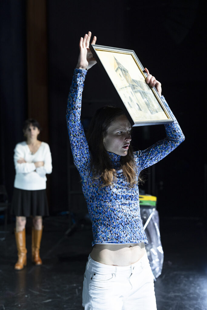 Maar deze reflex, deze (laffe?) zelfverdediging functioneert ook wanneer er iets totaal onverwachts opduikt, zoals een aquarel van de jonge Hitler in een kader van Samuel Morgenstern, zijn joodse compagnon, destijds. Hier is het fictie, maar het kan gewoon echt gebeuren. Technisch gaat het om de vraag naar de ‘herkomst’ van het stuk, want enkel als daarvan bewijs bestaat, kan het voor veel geld geveild worden. Nu was ‘herkomst’ in nazi-Duitsland een zéér beladen term, en dat voelen deze figuren zeker ook aan, al doen ze alsof ze zich daar niet bewust van zijn. Tot de joodse Judith zich aangesproken voelt om hierover door te gaan, want haar familie was slachtoffer van indringende, dodelijke vragen over ‘herkomst’. Nicola en Philipp verdedigen zich, ze noemen Judith overgevoelig, ze merken niet dat ze het antisemitisme – alsof het een deel is van de ‘Duitse cultuur’ – hun uitspraken bezoedelt. Nicola begint zelfs over de Palestijnen, alsof dat er hier iets mee te maken heeft, waarop Judith in een onhandige zionistische kramp schiet. Meteen gaat het wel over vandaag, over de kramp waarin heel weldenkend Duitsland sinds 7 oktober 2023 geschoten is. Meestal zijn het nog kleine uitschuivers, zoals Philipp die over zijn vrouw zegt dat “haar vader een normale Duitser is”, maar ze vormen een patroon. De kunsthistorische experte is daarin nog het meest schaamteloos, helemaal bezeten door haar expertise – nazikunst dus. Het kan geen toeval zijn dat er op antisemitische hondenfluitjes geblazen wordt wanneer het over geld gaat, want die perverse collusie tussen jodenhaat en kapitalisme heeft A.H. in 1933 tot rijkskanselier gemaakt. Wie in deze familie uit de niet onbemiddelde middenklasse, dat vermoed ik toch, bezwaar maakt tegen een financieel erg aantrekkelijke deal, krijgt de laagste verwijten naar zijn hoofd. En die dissidente, Judith dus, maakt vervolgens zelf de raarste sprongen, tot en met een indecent proposal aan de potentiële koper – die niet verbergt hoe aantrekkelijk hij haar vindt. Menselijke lelijkheid, in overtreffende trap. Het kitscherige schilderijtje, met de kenmerkende zin voor detail waarmee de jonge A.H. schilderde, maakt iedereen ziek, letterlijk (Fabians kwetsuur die ontsteekt) en figuurlijk (alle anderen).