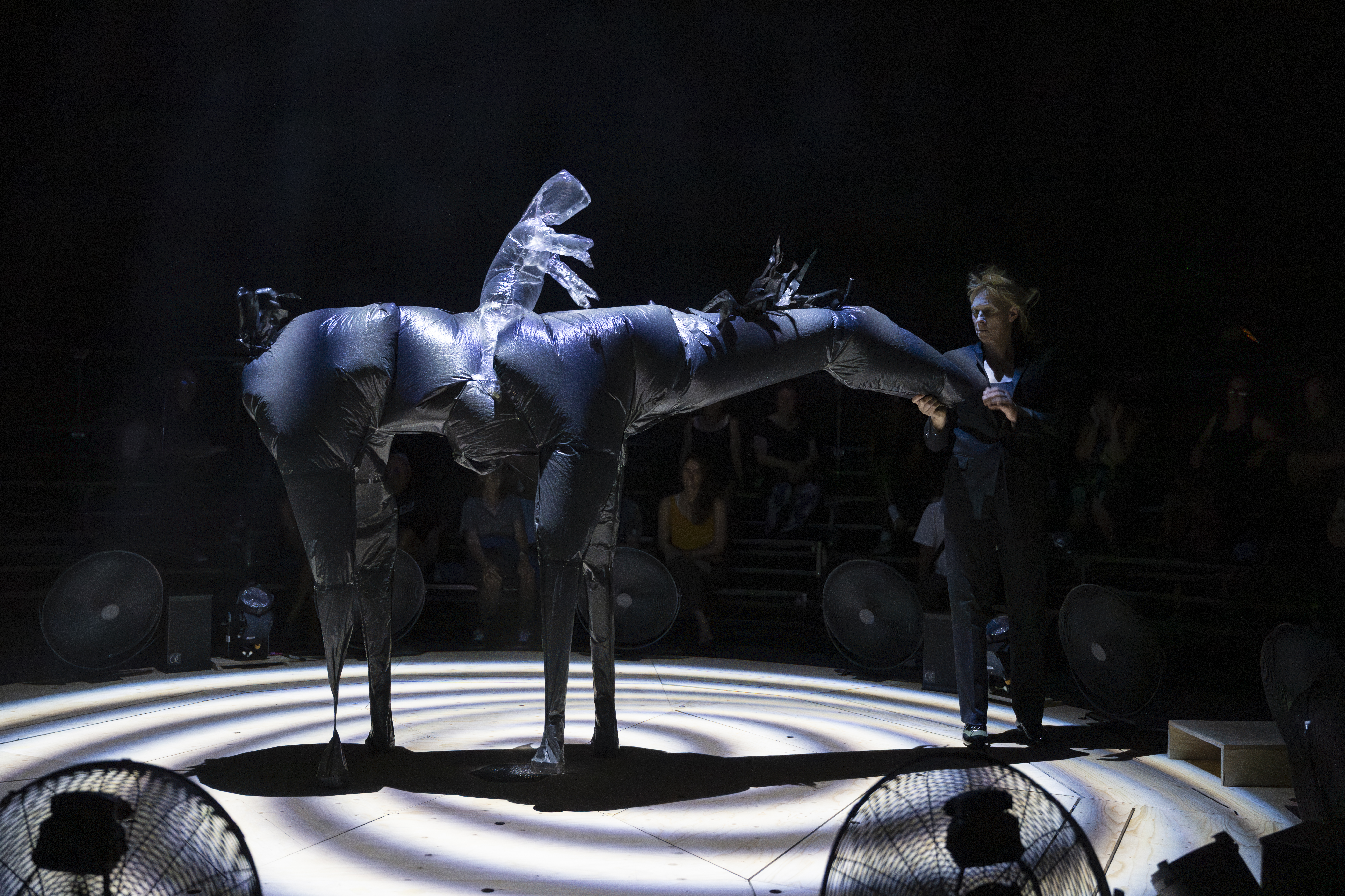 Met ventilatoren opgesteld rond een verticaal speelveld ontvouwt zich een samenspel van licht en plastic – broos, bloeddorstig en visueel overdonderend. Elke scène bestaat uit een choreografie van plastic flarden die zich, eens opgetild door de wind van de ventilatoren, ontpoppen tot paard, skelet of mannetje. Ze worden begeleid door muziek, zoals Schuberts Erlkönig, of geluidsopnames zoals van een dravend paard. De bühne is cirkelvormig, omgeven door een tribune. Aan weerszijden staan twee in het zwart gehulde performers, waaronder Phia Ménard. Hun rol is grotendeels technisch: ze grijpen in wanneer een plastic zak vastloopt in een ventilator. Op zeldzame momenten komt Ménard ook op de scène, waar ze (met een plastic wezen) meedanst, maar over het algemeen blijft de menselijke aanwezigheid minimaal. De scenografische compositie, de ongebreidelde visuele fantasie en de ingeniositeit van dansende plastic zakken brengen me terug naar knotsgekke circusvoorstellingen waar ik als kind naartoe ging; waarin het ene magische trucje het andere opvolgde en de houten bankjes steeds harder begonnen te wiebelen onder het gewoel van enthousiaste kinderen. Ditmaal was ik omringd door volwassenen, die eveneens tussen de scènes door wild applaudisseerden.