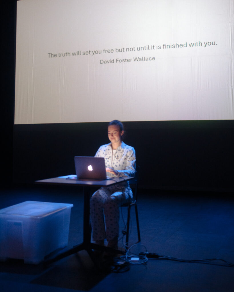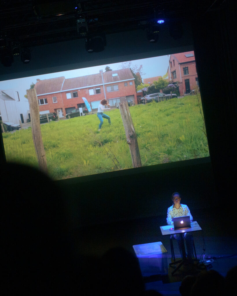 Maar waarom moet Verbakel dan nog zelf aanwezig zijn op het podium? Slechts één keer komt ze zelf aan het woord, wanneer ze een brief van een advocaat voorleest: zonder microfoon, zonder emotie, statisch op de stoel waar ze een uur lang op blijft zitten. Verder zwijgt ze, kijkt ze het publiek aan en klikt door de video’s. Veel voegt ze niet toe aan de actie op het scherm, toch? Denken dat de voorstelling als videowerk had kunnen bestaan, zou echter een onderschatting betekenen van de impact van de aanwezigheid van een performer op een podium.