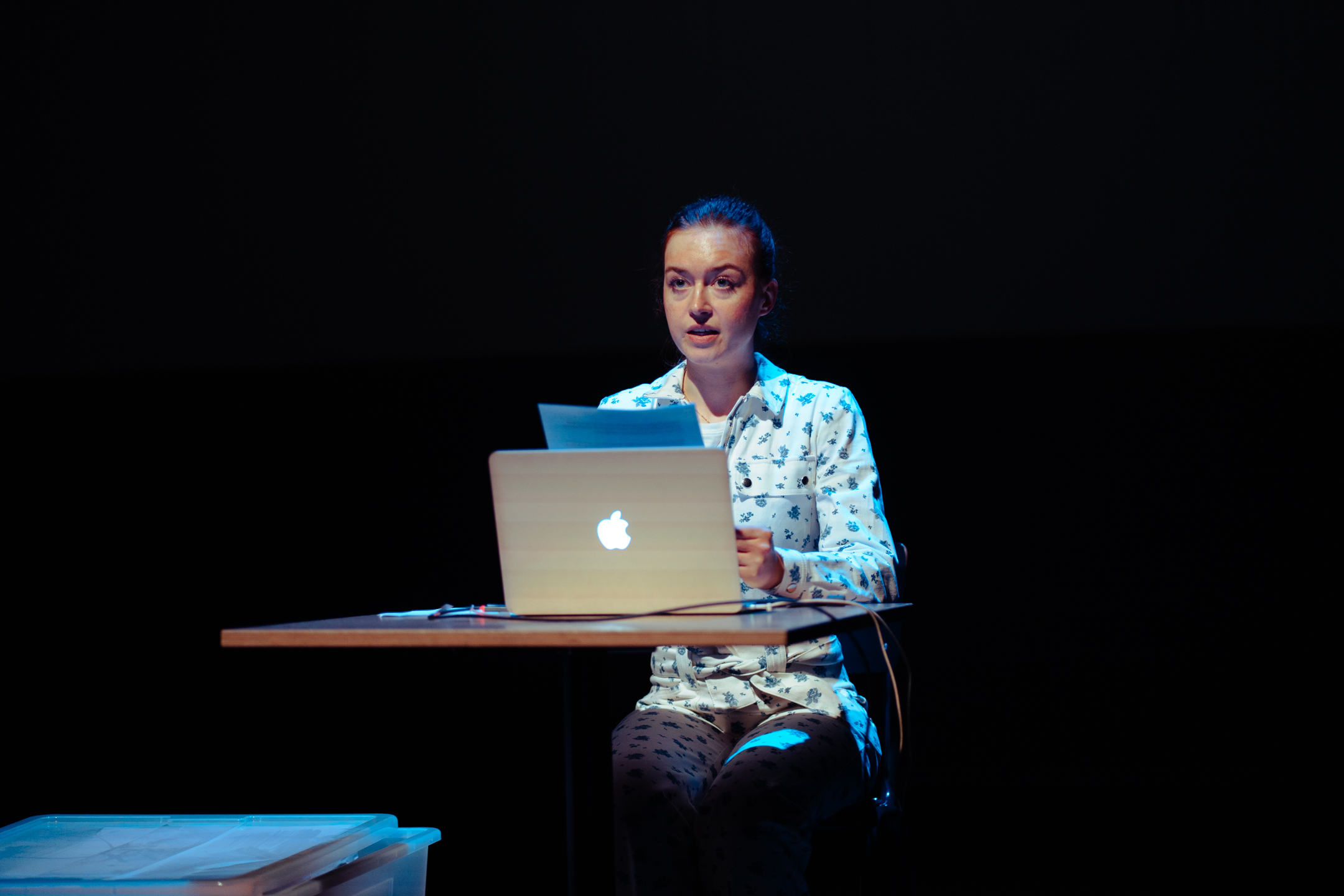 Maar waarom moet Verbakel dan nog zelf aanwezig zijn op het podium? Slechts één keer komt ze zelf aan het woord, wanneer ze een brief van een advocaat voorleest: zonder microfoon, zonder emotie, statisch op de stoel waar ze een uur lang op blijft zitten. Verder zwijgt ze, kijkt ze het publiek aan en klikt door de video’s. Veel voegt ze niet toe aan de actie op het scherm, toch? Denken dat de voorstelling als videowerk had kunnen bestaan, zou echter een onderschatting betekenen van de impact van de aanwezigheid van een performer op een podium.