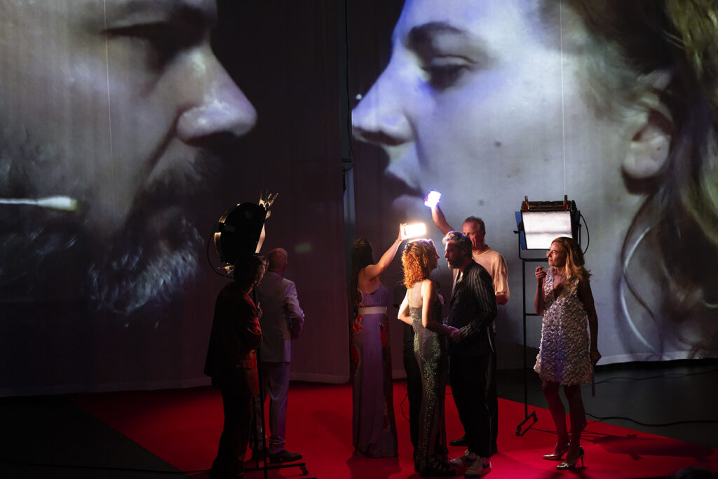 Terwijl het publiek plaatsneemt kijkt het al in het labyrinth van betekenislagen: op het voordoek wordt een sleutelscene uit Cassavetes’ film in een loop vermengd met live camerabeelden achter het doek, waar de DE HOE-spelers zitten te wachten. De Cassevetes-scene is die waarin Myrtle aan de hotelkamerdeur van Maurice verschijnt met twee vragen. De eerste vraag is die naar liefde (‘Do you love me?’), de tweede is de vraag om van hun première iets ‘echts’ te maken – to find something human in it. De twee vragen vormen de twee poten waarop DE HOEs Opening Night steunt, en het zijn zoals vaak twee begrippen die hun ontkenning in zich dragen: deze Opening Night zal gaan over love and the lack of it, en ook over spelen en zijn (vermeende) tegendeel: zijn, voelen. Dat allemaal, voor de eerste keer, in verhouding tot ‘grote’ schaal: hoe werkt dat, authenticiteit, intimiteit, op een grote bühne, omringd door een grote groep cast- en crewleden, gezeten voor een publiek van 500 man?