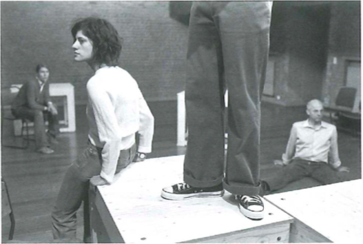 JR: Het is moeilijk om je ver te houden van één al te duidelijke betekenis of positie. We slagen daarin door ons voor te stellen dat we in vele verschillende, wat wij noemen, films zitten. Als we ervoor zouden kiezen om in één film te spelen, zou de mobiliteit, of beter de potentie van mobiliteit en verandering, van wat mogelijk zou kunnen zijn, maar waar we nooit geraken, erg klem blijven. Dus probeert ieder van ons aanwezig te zijn, tegelijkertijd, op drie niveaus van deze ‘films’: we erkennen dat we op een podium staan in een theater voor een publiek, maar tegelijkertijd kadreert ieder van ons de anderen in een persoonlijke film (waar die anderen niks van hoeven te weten), óf weten we dat we alle vier in dezelfde film zitten, een film die we ooit samen bekeken hebben. Deze films zijn constant, maar nagenoeg onmerkbaar, aan het verschuiven en het veranderen.