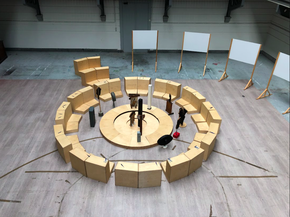 Met deze onderliggende gedachten ontmoette ik vijf studenten van de master drama en performance — Emiel, Yorick, Maïthé, Maria en Tibau — om samen een week lang te werken rond plaats maken voor kwetsbaarheid binnen het KASK, voor studenten én docenten. Want kampen ook docenten niet met gelijkaardige worstelingen? Kunnen we een gespreksvorm ontwikkelen die dit bespreekbaar maakt? En in welke ruimte zou dat kunnen plaatsvinden? Als theatermaker hoopte ik het onderzoek dat we een week lang zouden voeren via scenografie en dramaturgie te sturen, en een nieuwe gespreksvorm te ontwikkelen.
