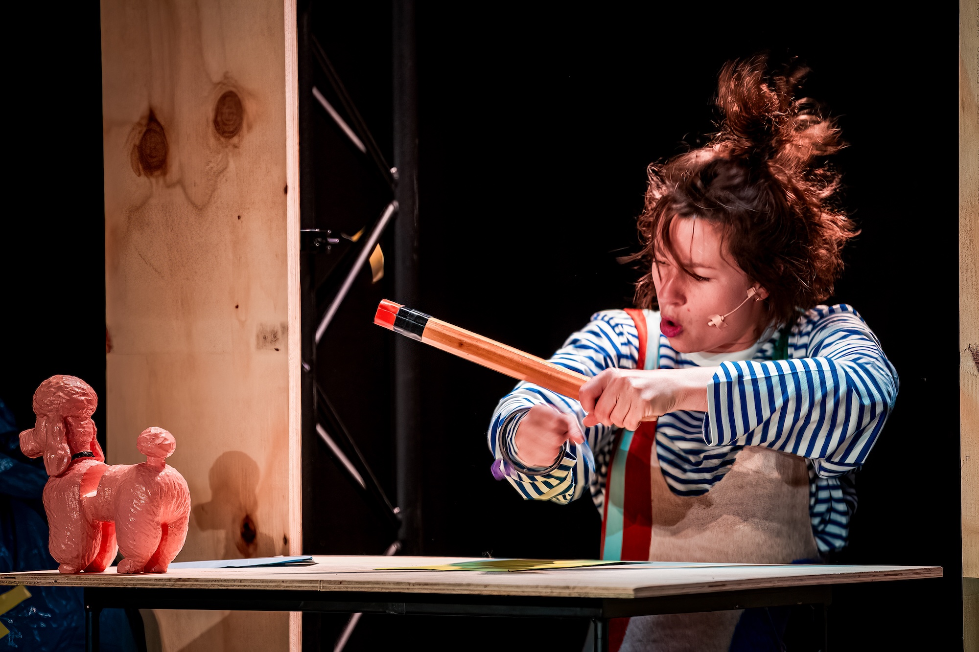 Het goedgevulde podium stelt een gezellig, ietwat rommelig straatje voor. Aan de ene kant woont het meisje (Anouck Luyten). Het huis op de andere hoek wordt bewoond door een muzikant. Van bij de openingsscène neemt Luyten de kleuters en hun gevolg mee in haar uitbundig spel met uitvergrote mimiek. Zonder woorden maar met brede gebaren toont ze haar knusse huis en tovert ze uit een postpakje onder andere een groot potlood tevoorschijn. Binnen het ambachtelijke decor lijkt het wel een kleine knipoog naar de online unboxing-trend.