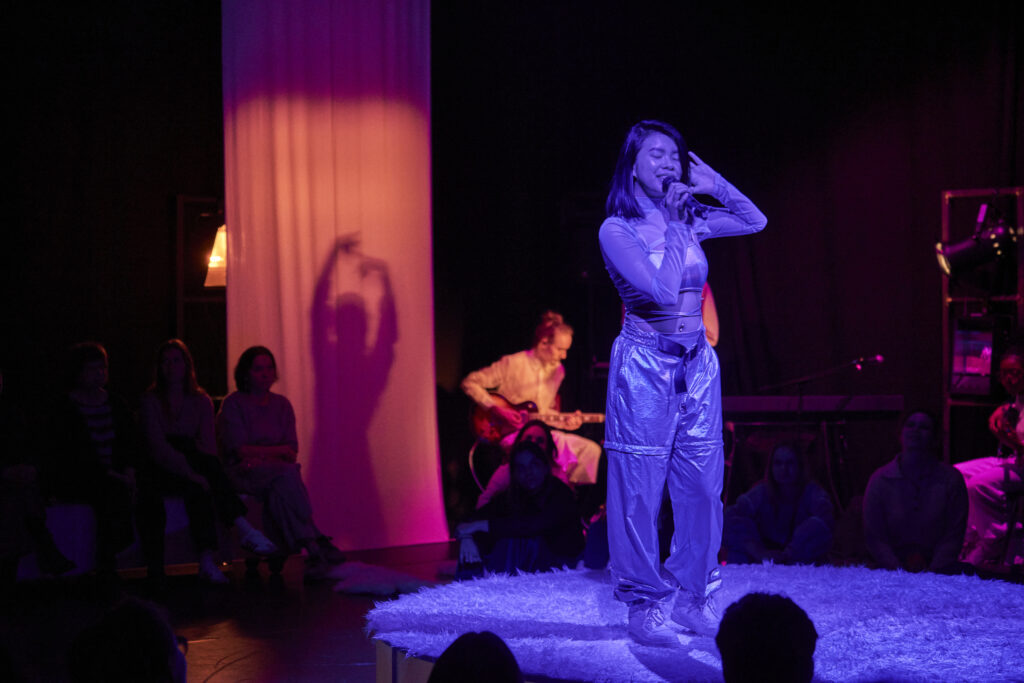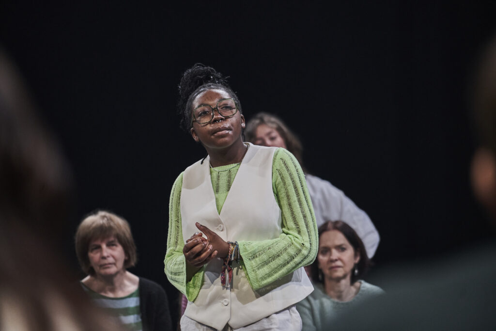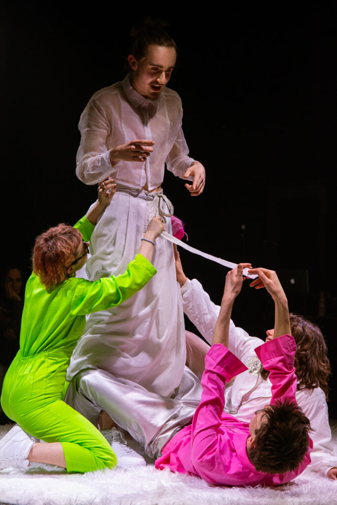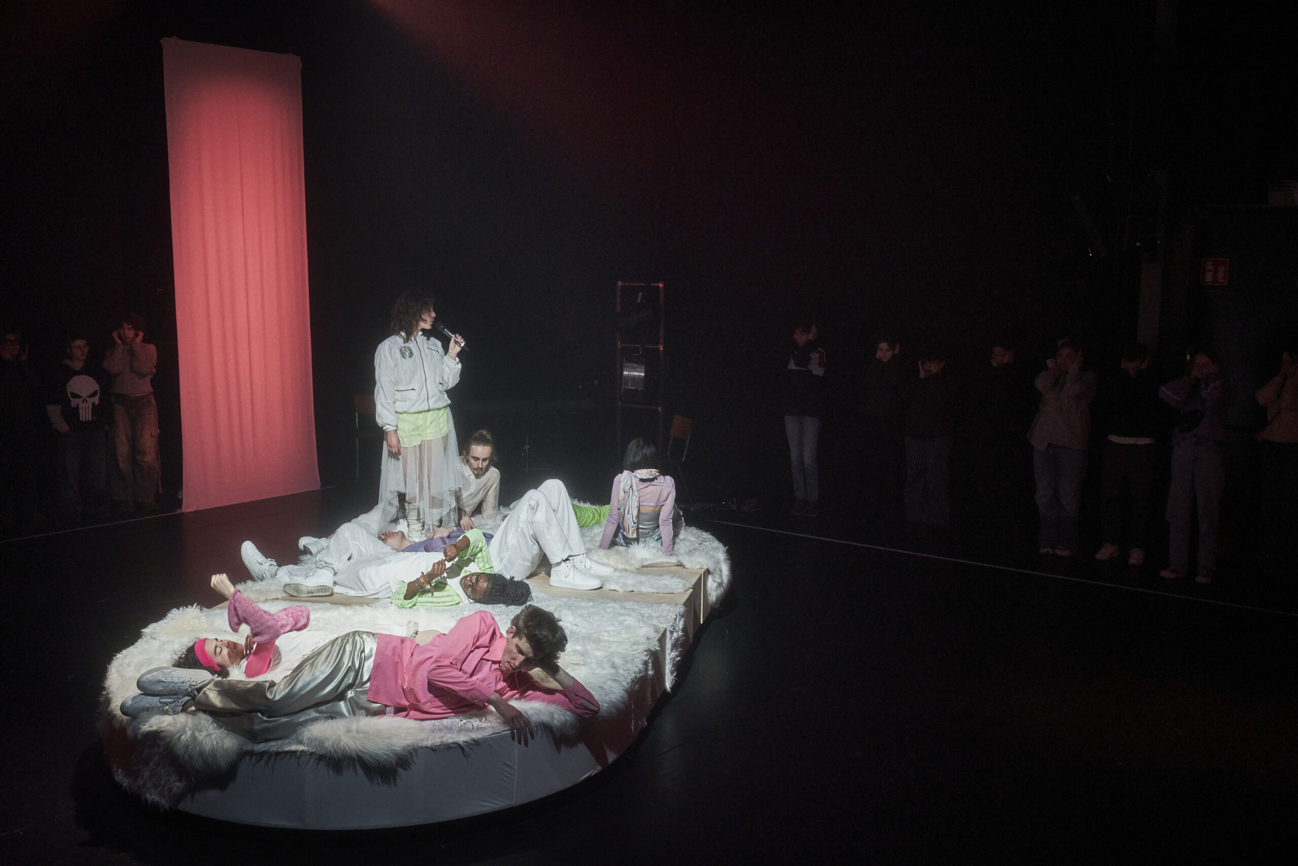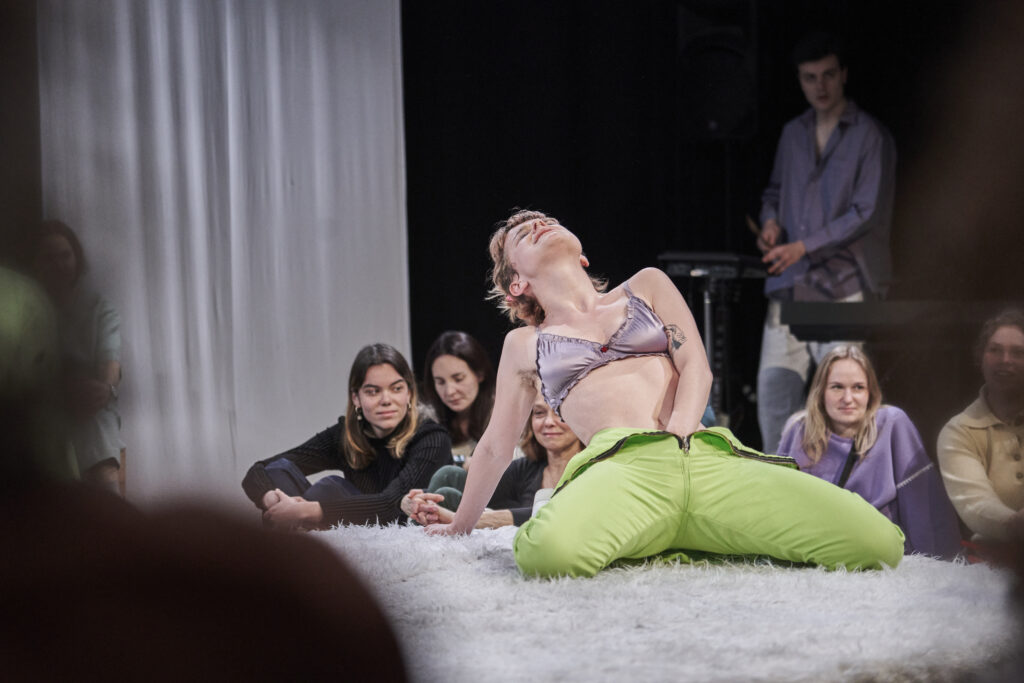 De voorstelling lijkt die emotionele zwaarte ook niet te willen opzoeken. Zo’n pestscène kan nogal effect hebben op een toeschouwer, een effect dat weggeduwd wordt als dat niet verder wordt uitgewerkt in volgende scènes. Maar daar emotioneel niet te lang op ingaan is waarschijnlijk wel de juiste keuze als je het thema van seks toegankelijk en bespreekbaar wilt houden. Dat wordt ook grotendeels gesteund door het immense spelplezier van de hele ploeg. Er zijn tal van speelse momenten tussen de spelers en de muzikant, waaruit ook vertrouwen en comfort spreekt. Misschien dat woede na een moeilijke scène daarom ook niet blijft hangen: het lijkt een vriendengroep te zijn die bij elkaar wel eens over de schreef durft te gaan, maar niet kwaad blijft op elkaar. Naar het einde toe speelt Montana (Tachelet) een ludieke, half-pedagogische masturbatiescène waar de rest over the top op reageert. Ze blijft doorgaan en eindigt haar performance grappend met ‘Dit is theater, ik ga toch niet masturberen voor een volle zaal?’ Je voelt in Q&A dan ook niet dat het een pedagogische voorstelling is. Er worden gewoon vragen gesteld en vooral met elkaar comfortabel in interactie gegaan.