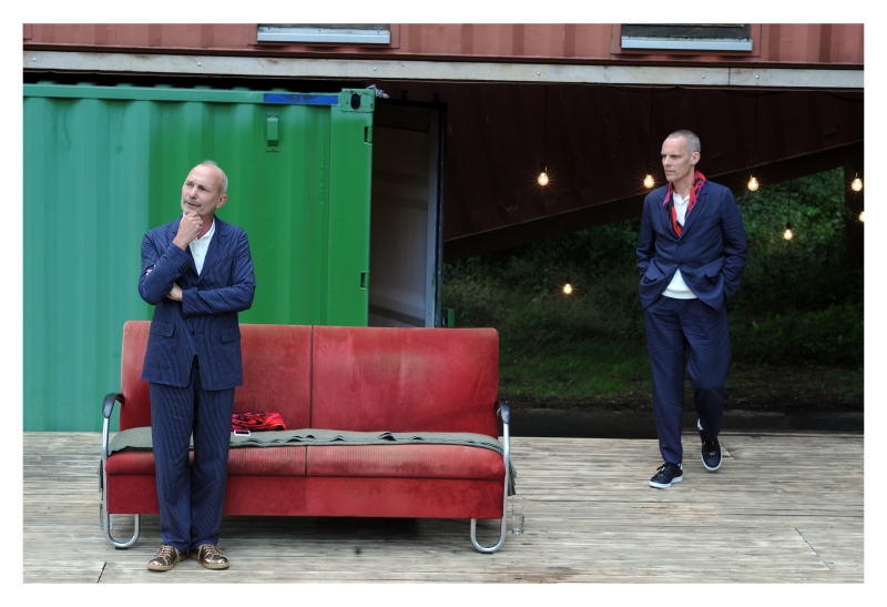 Wat een prachtige speelplek heeft het Antwerpse Compagnie Marius toch. Midden in de groene weelde van het Middelheimmuseum lijkt een vertoornde reus aan het smijten te zijn geweest met vier enorme zeecontainers – ze zijn schijnbaar willekeurig op elkaar neergestort en vormen in hun wat absurde constructie de kantoren en repetitieruimte van het gezelschap. Een houten halfrond ervoor, en daarvoor de gekende openluchttribune van de Mariussen, et voilà: het décor voor Sit-down comedy #1 is klaar. Een schraal zonnetje valt over het speelvlak, waar twee dandyeske mannen in identieke kledij ons opwachten, elk op een hoek van een rode, versleten tweezit. Rechts van ons ruist de weelderige kruin van een eik, links hebben we zicht op Chris Burdens onnavolgbare Beam Drop – over dat kunstwerk van in de grond geboorde poutrels zouden Atzbacher en Reger, die de hoofdrol spelen in de venijnige komedie van Thomas Bernhard, zeker hun zegje hebben willen doen.