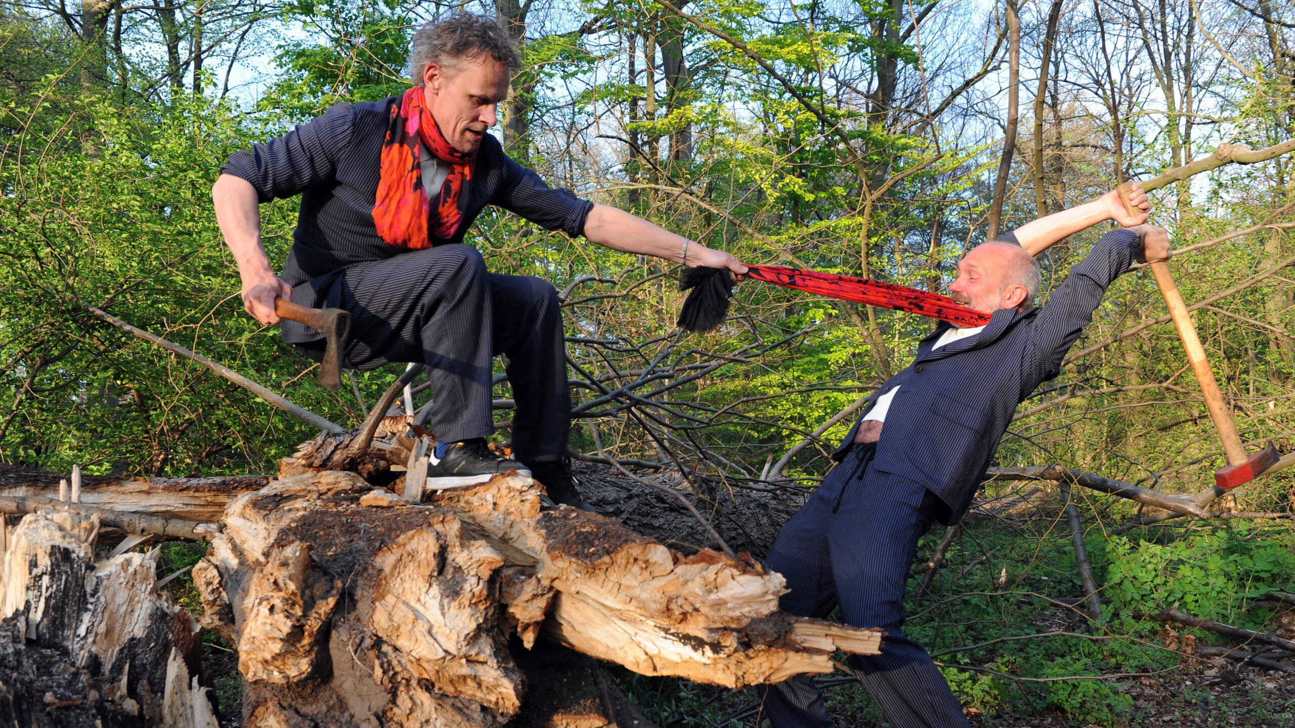 Van Trier en Van den Berg hanteren voor hun enscenering hetzelfde procedé als in Oude Meesters, en de leessleutel daarvoor reiken ze bij het begin van de voorstelling zelf aan. Of er iemand de pianomuziek kent die zachtjes opklinkt? Met de superieure minachting van Thomas Bernhard zelf vegen ze de (domme, domme!) suggesties uit het publiek van tafel – neen jongens, het gaat om de Zweistimmige Inventionen van Bach. Ze zullen de monoloog van Bernhard dan ook verdelen in twee stemmen en elkaar daarmee aanvullen, echoën, bevestigen, voortstuwen. Het splitsen van het vertellerspersonage is een betekenisvolle zet, waarmee Marius niet alleen het effect van het lege elkaar-na-praten thematiseert, maar ook de strijd om ‘het woord’ te krijgen fysiek gestalte geeft. Een van de meest prangende vragen bij het lezen van Bernhard is steevast ‘Wie zegt dit nu?’ Is het de auteur (Bernhard) zelf, is het zijn vertellers-alter-ego? Is het de acteur die deze verteller gestalte geeft? Is het een personage dat de verteller citeert? In Houthakken liggen bijvoorbeeld lange brokken ideologisch discours in de mond van de Burg-acteur – zo lang, dat we op den duur vergeten wie er aan het woord was, en de vertelperspectieven ineen vloeien. Daar gooit Marius dan nog eens zijn ontdubbeling bovenop.