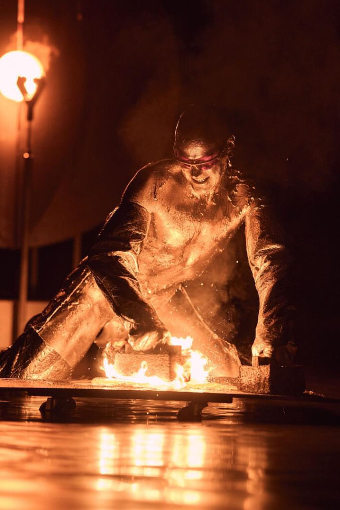 Achter op de scène staat intussen een glasoven te branden, die een voelbare hitte op de zaal afstraalt. Door een gat zien we het vuur branden. Het is een spannend en hels tafereel, dat verschillende associaties naar boven brengt: een science fiction-universum, een Hellraiser-achtig figuur en een ijzersmederij. Wat gaat hier zich straks afspelen?