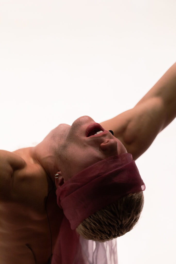 Na de primal scream, vertelt Sommers over een fantasie die ze al lang heeft. Ze droomt ervan te worden aangeraakt door de blikken van wie haar door een peephole bekijkt. Het publiek is weer gaan zitten, maar wordt aangespoord om de lichamen van de performers te ‘strelen met hun blikken’. Die ‘kom dan!’-attitude brengt me in de sfeer van feministische performances uit de 20ste eeuw – Abramovic die met Rhythm 0 geweld op haar lichaam uitnodigt, Yoko Ono die in Cut Piece het publiek wenkt om haar kleren te knippen.