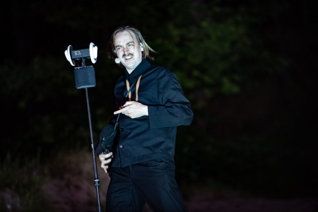 Dudkiewicz haalt ons snel terug uit de fictie. Eens we gezeten zijn op de tribune tegenover de diepe duinpan waarin hij zijn one man show zal spelen, haalt hij met een vingerknip de soundtrack weg. In de beste traditie van het onttoverde theater stelt hij ons voor aan zijn sound engineer (Tomas Loos) en demonstreert hij het gebruik van zijn micro’s, die hem in staat stellen om deze audiofictie te creëren. Dat is slim: juist het onthullen van hoe weinig er is − niets in de handen, niets in de mouwen − zal de verbazing vergroten over wat we allemaal zullen voelen, meemaken, beleven. Dan is het tijd om er écht in te duiken. Knip!