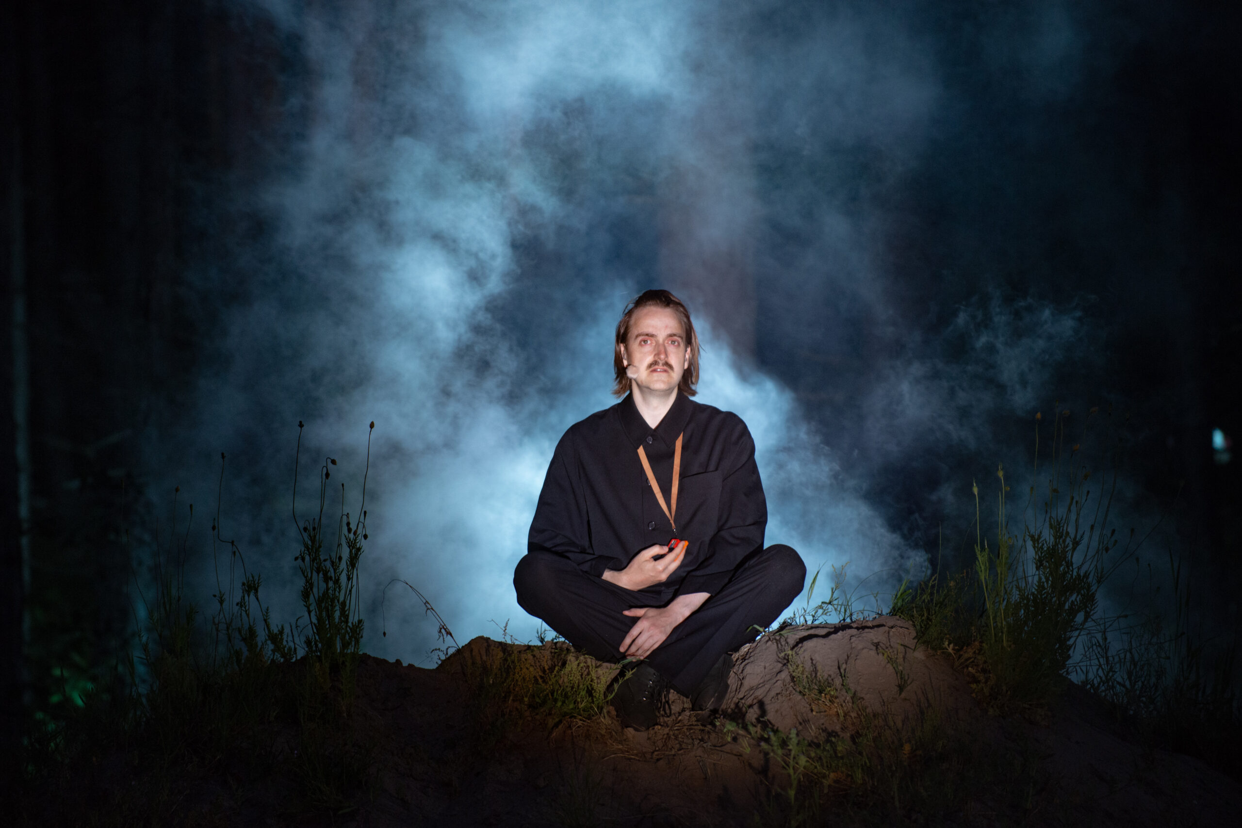We koppelen verbeelding nogal graag aan visuele impulsen, maar dat is een schromelijke onderschatting van onze oren, zo bewijst The Last Chapters. Dudkiewicz zal erin slagen om in zijn eentje, optornend tegen het overweldigende duinlandschap op Terschelling, een epische eindstrijd te verbeelden, enkel gebruikmakend van auditieve middelen: zijn stem(men), geluidseffecten, hightech microfoons. Of preciezer: een immersief geluidssysteem met binaurale audio, zo wordt ons verteld, waarbij links en rechts apart van elkaar worden aangestuurd. Het bewijs van wat zo’n systeem vermag, begint al op het moment dat we naar de locatie wandelen. Denk: een zwoele zomeravond, het publiek kuierend onder de avondzon langs een idyllisch bospaadje, kwinkelerende vogeltjes alom. Zowat op de helft van ons pad krijgen we een koptelefoon aangereikt en van de ene seconde op de andere belanden we in de duistere, onweerachtige krochten van een zwarte onderwereld, waar de regen stroomt, kraaien onheilspellend krassen en jammerende stemmen zachtjes huilen. Voelen we plots een kille windvlaag, of verbeelden we ons dat maar?
