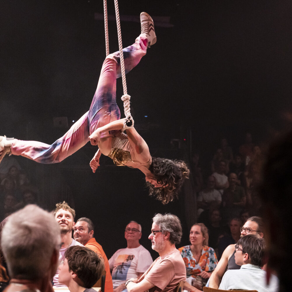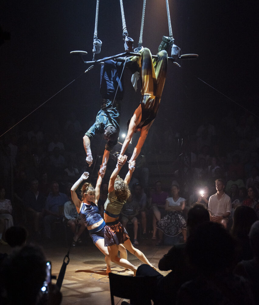 Daarmee is de toon gezet, en bevindt Tout va hyper bien zich hand in hand met het publiek in een spannende spreidstand, die trapeziste en zangeres Juliette Correa behendig in stand houdt. Even gemoedelijk als ze in gesprek zit met enkele tafelgasten hangt ze opeens boven de hoofden van haar gezelschap en is de voorstelling begonnen. Ze laat zowel haar lichaam als het publiek soepel wennen aan de trapeze, terwijl haar Franse getater de act vrolijk doet meedeinen met het gonzende rumoer dat de tent tijdens het wachten heeft gevuld. Al handen schuddend, ‘Ça va?’, bepalen de korte ontmoetingen de richting van haar bewegingen. Ergens onderweg reikt ze me haar jasje met de vraag of ik het wil bijhouden voor haar. Een eenvoudige vraag, maar ik voel me uitgenodigd tot tactiele zorgzaamheid. Indrukwekkend buitelend vervlecht haar act zo onmiddellijke samenwerking en broze kennismaking. Hoeveel performers zijn er welgeteld aanwezig in deze tent?