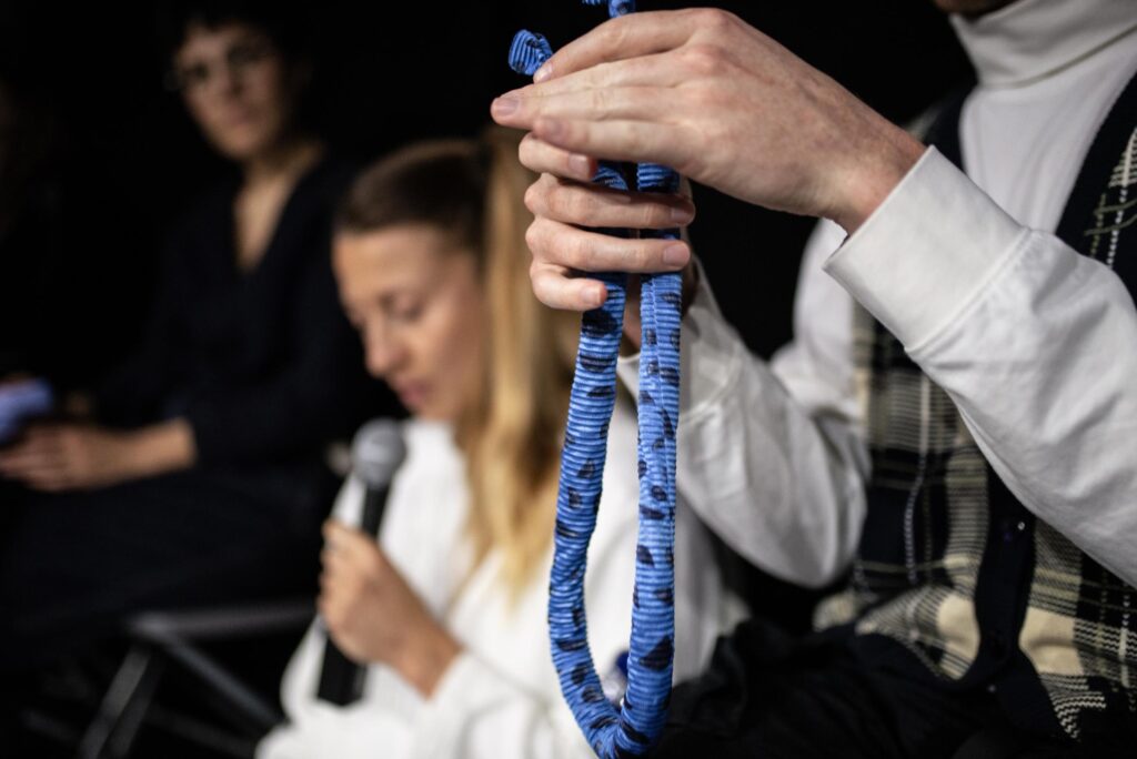 Helen D’Haenens, Raphael Philipe Damasceno Ferreira de Moura en Christine Sollie wachten hun publiek op in het midden van een klein zaaltje. Ze dragen blauwe outfits en ondersteunen een constructie uit neonroze en -oranje staven. De stoelen staan opgesteld in een kring rondom hen, en op elke stoel ligt een soort stressbal: een zakje — soms cilindervormig, soms ovaal met grillige uitsteeksels — met daarin plastic balletjes.
