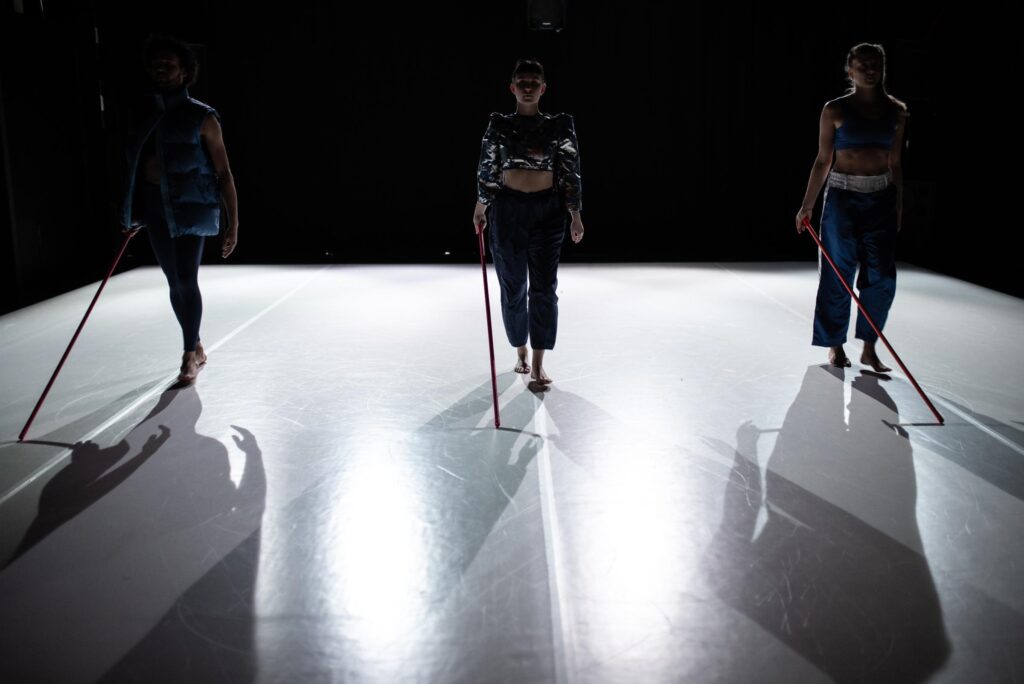 Zo’n confrontatie blijft uit: zachtjes ‘ontkoppelen’ de dansers zich en verlaten de zaal. Ook wij worden naar een volgende zaal gegidst. Ons tastobject ruilen we in voor een neon staafje ter grootte van onze handpalm. De wandeling doorbreekt de spanning, maar die keert direct terug in de tweede zaal. Daar marcheren Sollie en Damasceno heen en weer, terwijl ze een onbuigzame neon stok voor zich uit schuiven als een soort blindenstok. Van voorzichtig aftasten is hier echter geen sprake, de mars oogt strak en assertief. Industriële geluiden en harde blauwe belichting completeren de autoritaire sfeer. Een pak slaag is ook aanraking natuurlijk.
